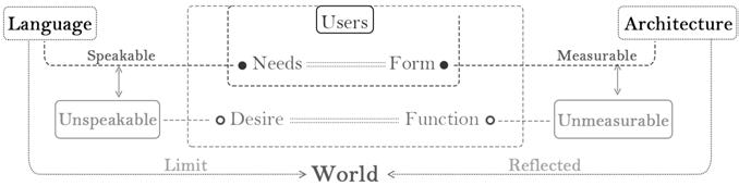 Among them, Kahn believed that space is the " desire " of the user for space. In real life, functional needs can be accurately described in terms of language and dimensions, but the space that supports desires cannot be described and falls into an unmeasurable category, corresponding to Wittgenstein's theory of the "unspeakable" boundary