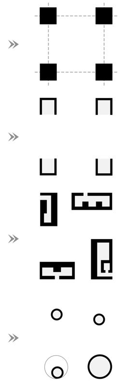 Integrating the functional requirements of the library, multiple attempts are made to combine the "Facts" section of the Table of Ideal Architectural Grammar. Based on the dimensional relationships and closure of the plan, suitable units are assembled and nested, resulting in the final plan texture.