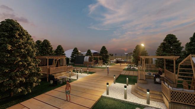A入口處 B休憩廣場 C露營區 D戶外用餐區 E景觀餐廳 F棧橋