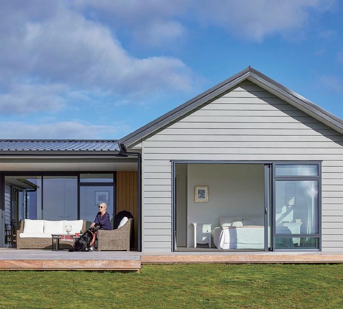 这栋别墅的外墙采用了James Hardie的Linea™护墙板, 涂上Resene.Quarter.Gravel的灰色墙漆,在阳光下显得十分柔 和,养眼的同时也现代感十足。