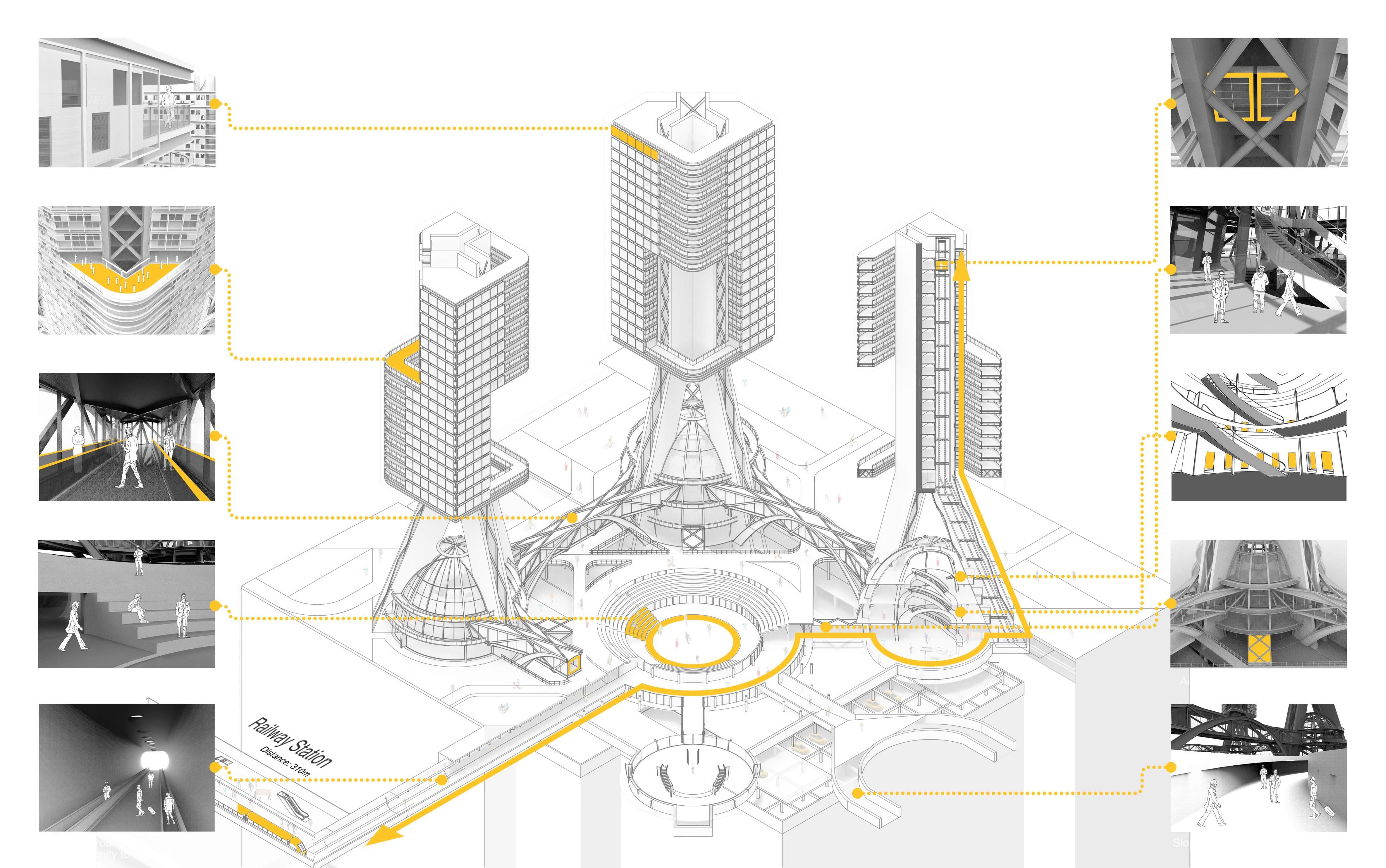 In this project, I explore megastructure based on the environment of a chaotic contemporary city. I focus on the train station area where people are in need of convenience and safety. The project is a building complex with residence and public space. Instead of a utopian proposal, the project aims to use megastructure as a new shelter within a mess of urbanized fields.