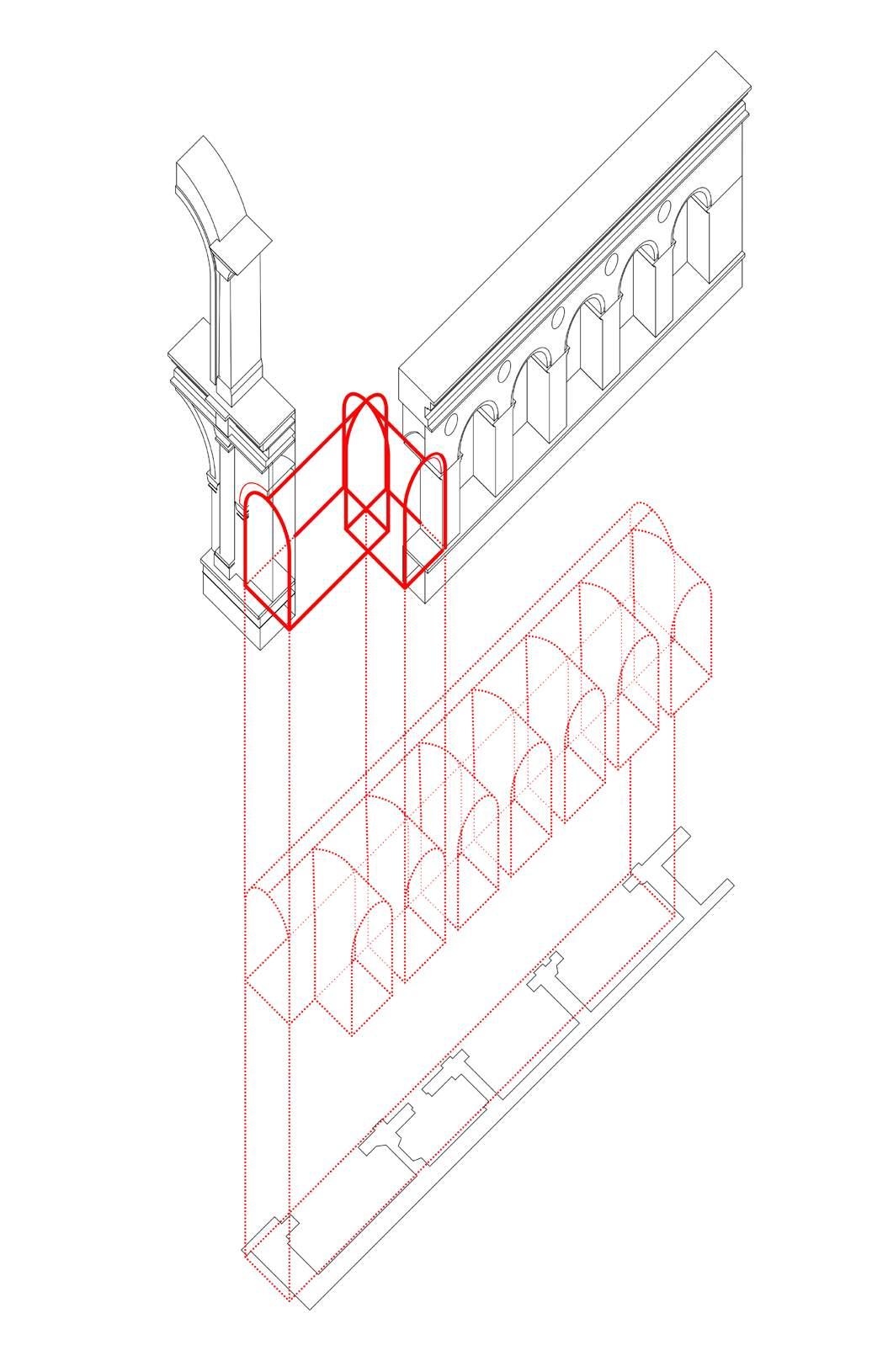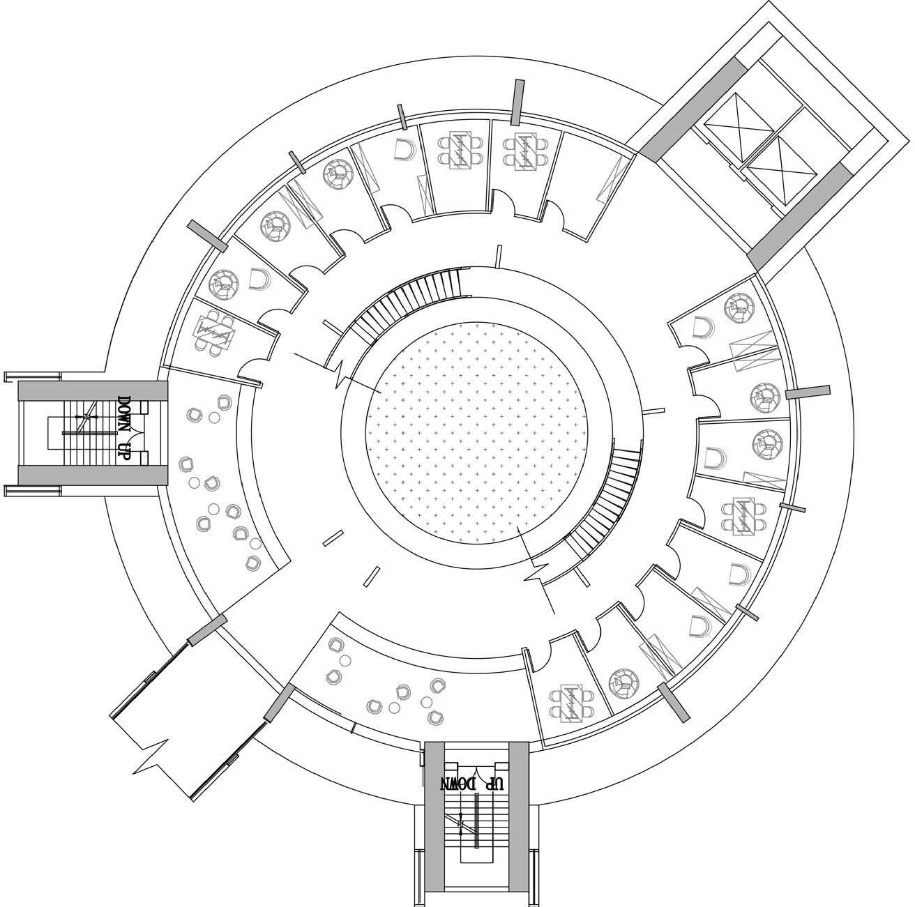 The various scales of a circle can adjust its property from a dot to a field, which applies various spatial metaphor to it. Inspired by Kusama’s paintings, this project explores the spatialization of 2D patterns. By cutting the original image with the curves extrated from the painting, the artwork is dissolved and reassembled, thus transformed into a one-story building with two types of space -- the meditation space embedded in the structural walls, which are deformed dots for single person to fit in; and the bubble chambers for public performance and rehearsal activities. The two space are clearly defined between silence and sound, while unified under similar graphic language.