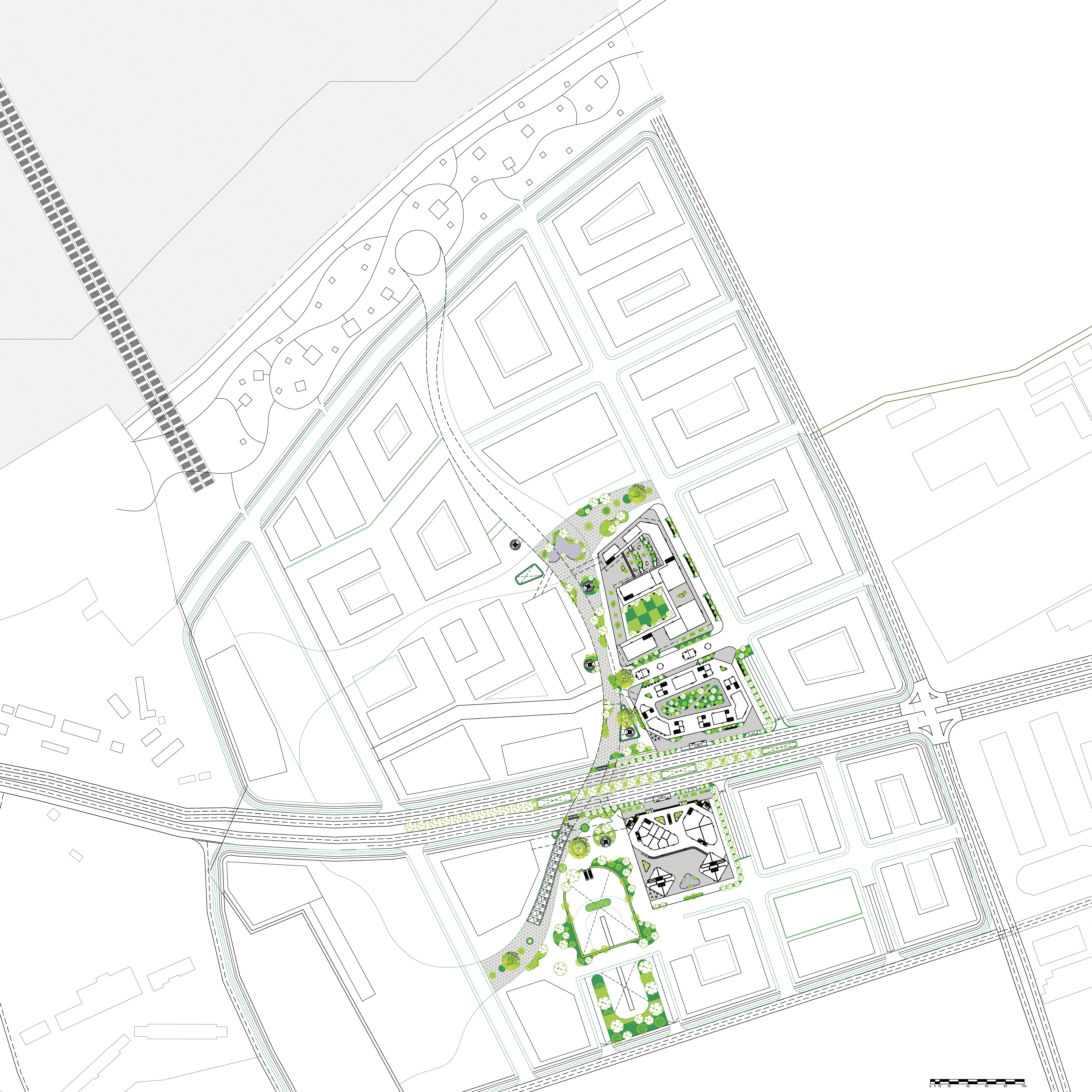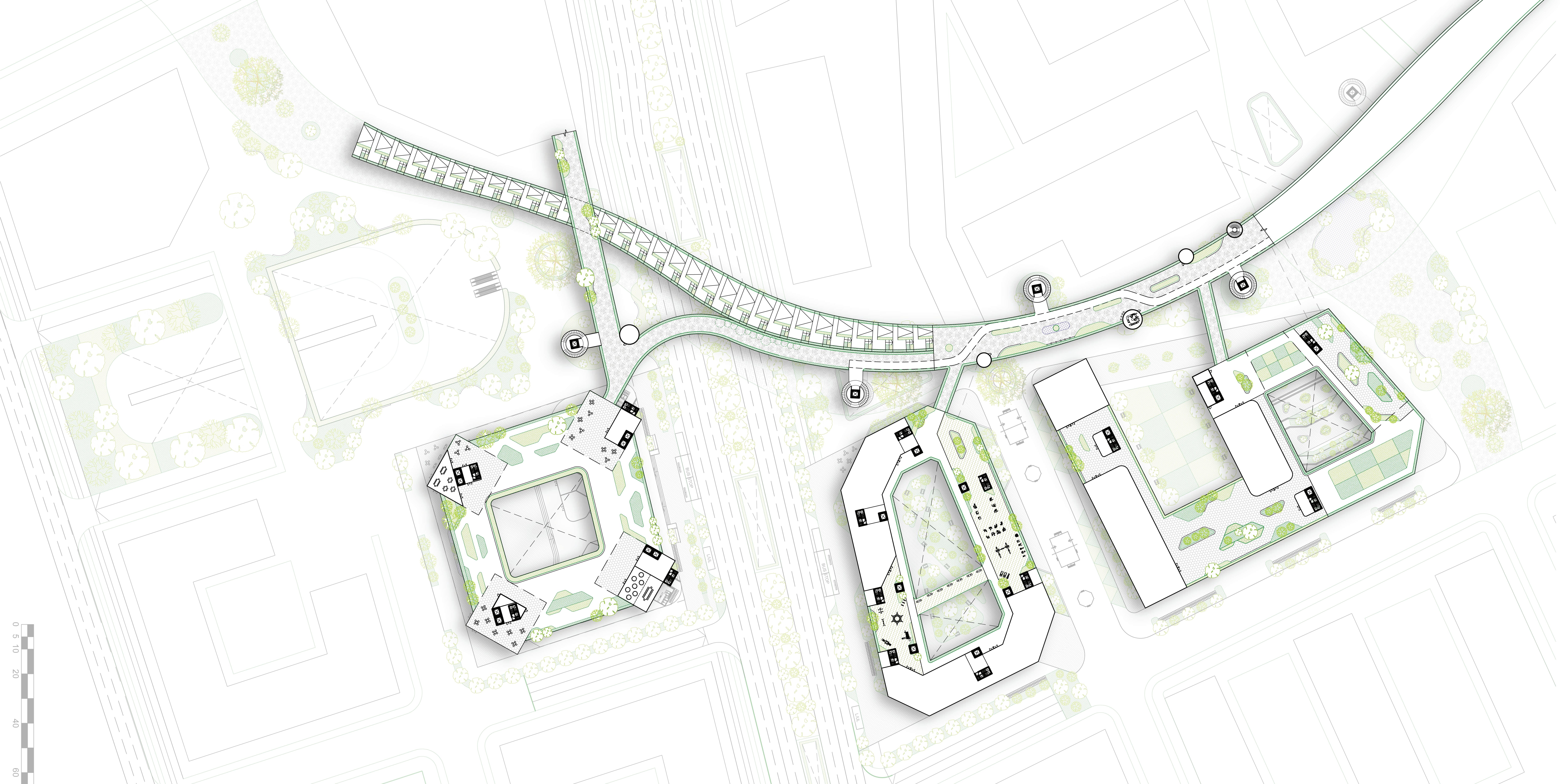 This main spine, running through the core of the site and linking to the transport hub, connects these spaces and offers efficient mobility options.