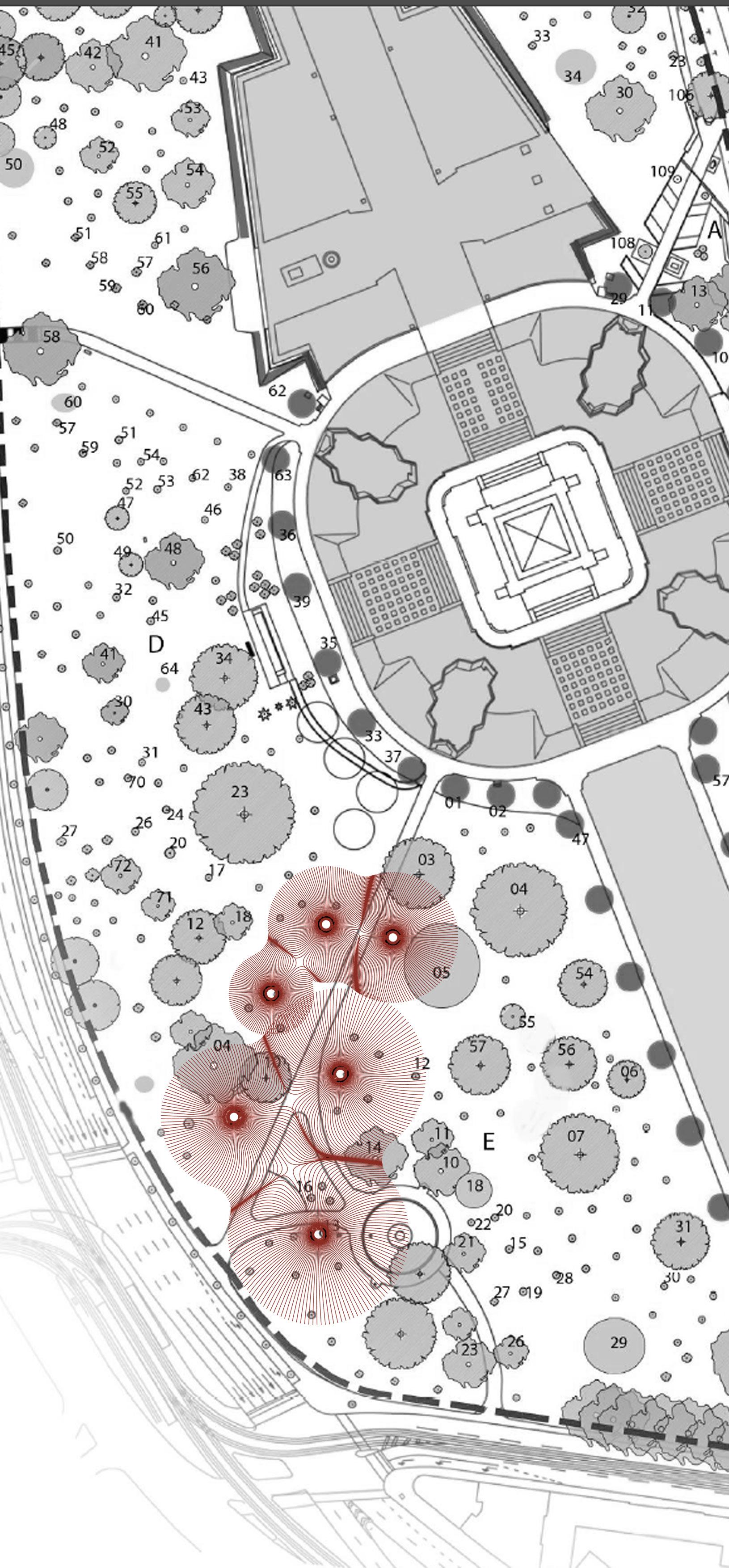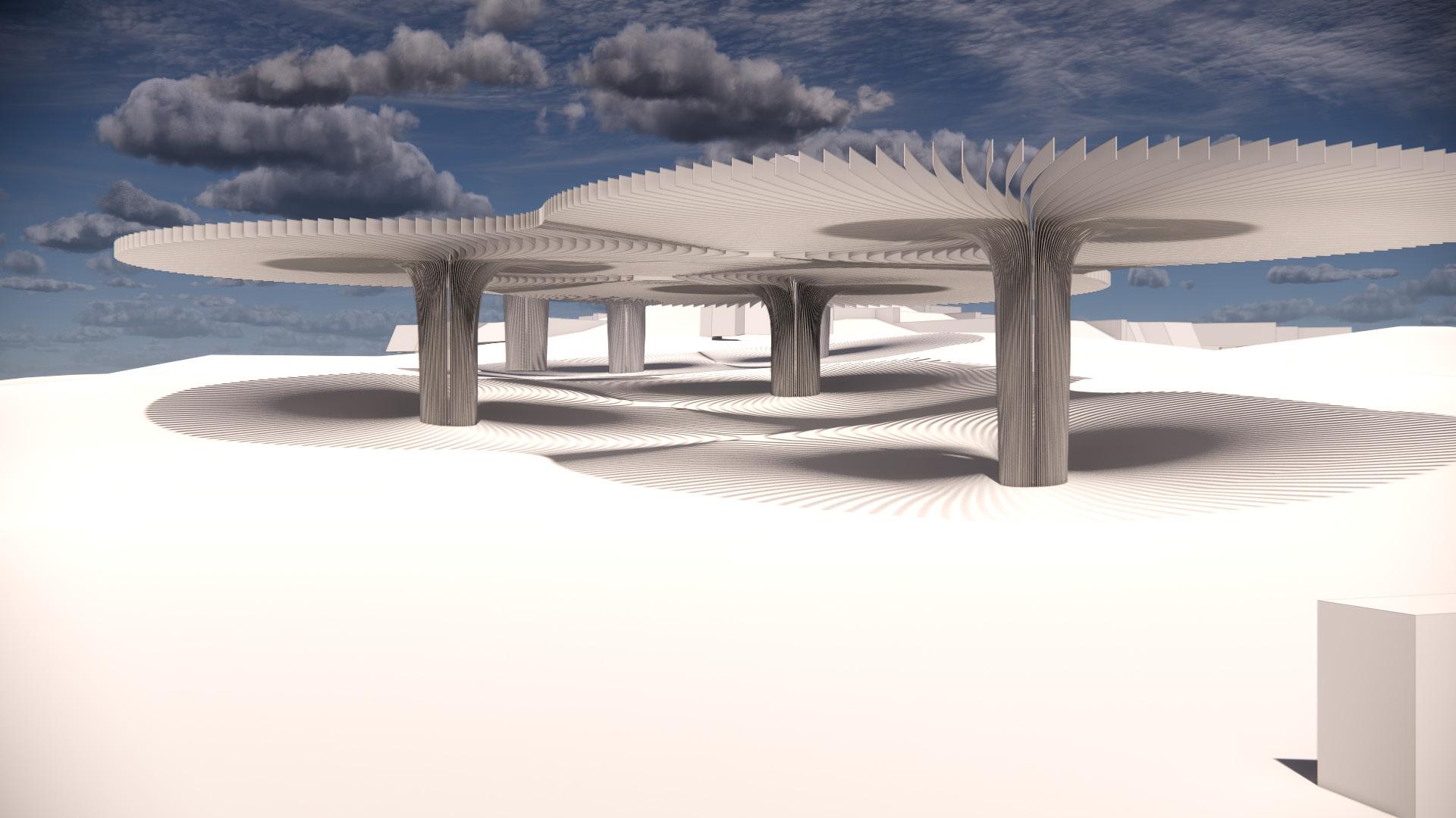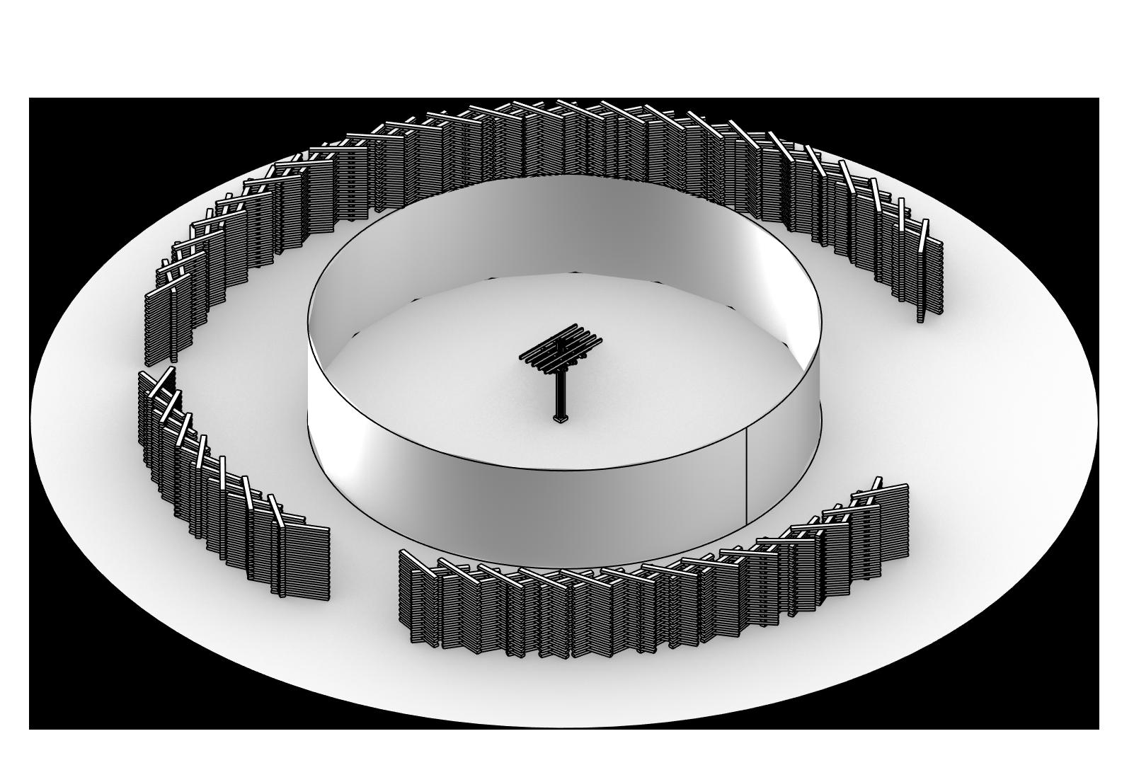 A forest made of trees that is not a forestAfter selecting a gathering point for non-indigenous trees, a circular evolution is created by using the distance between the numbers as the diameter, resulting in a large roof covering a series of artificial tree trunks arranged along the path