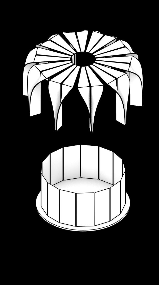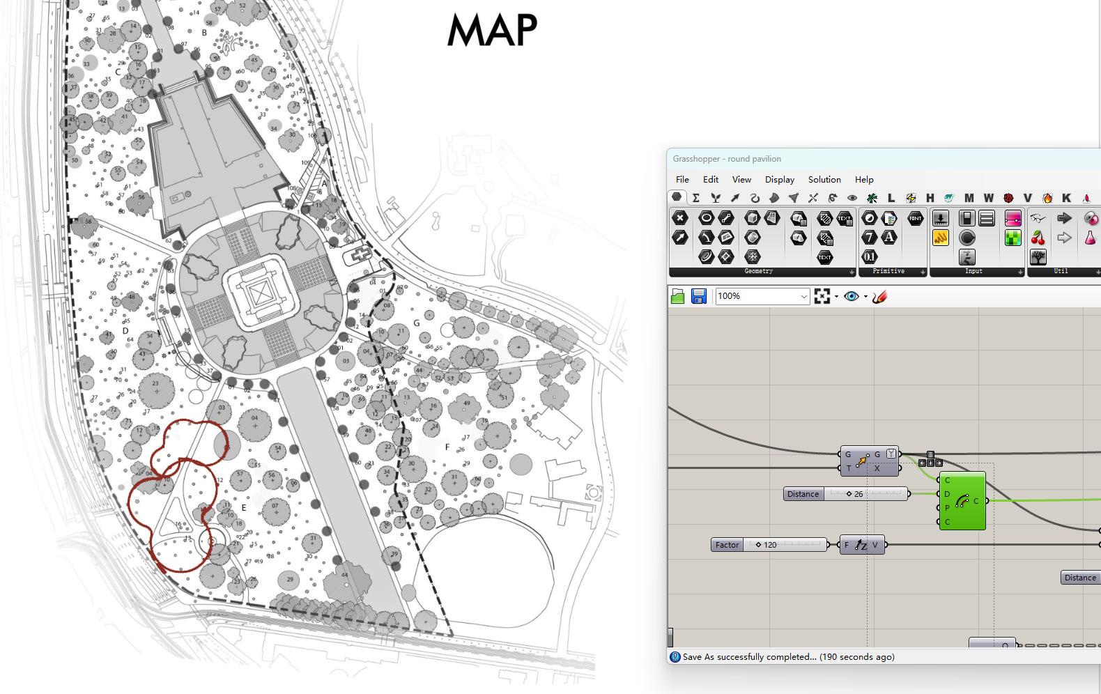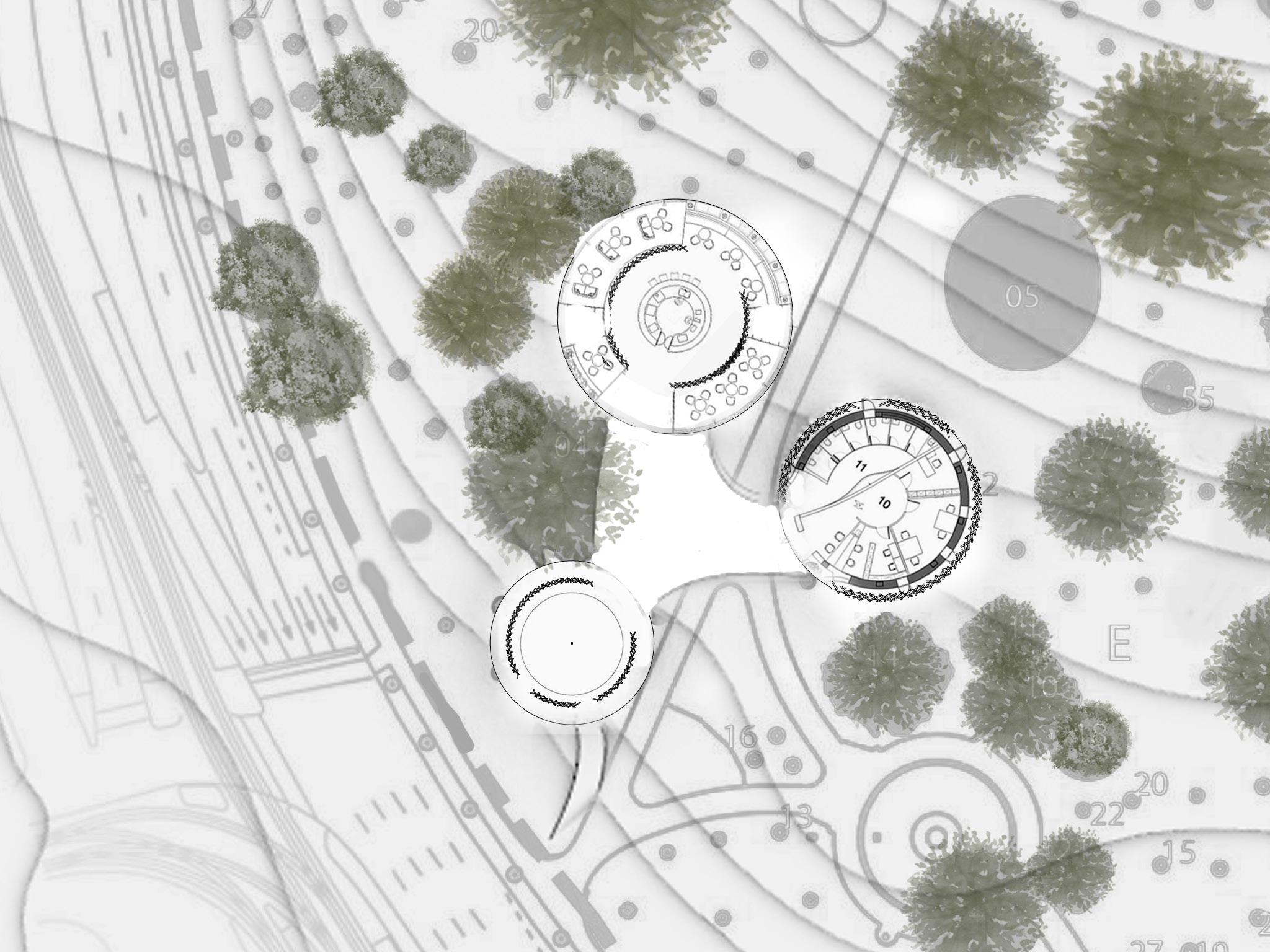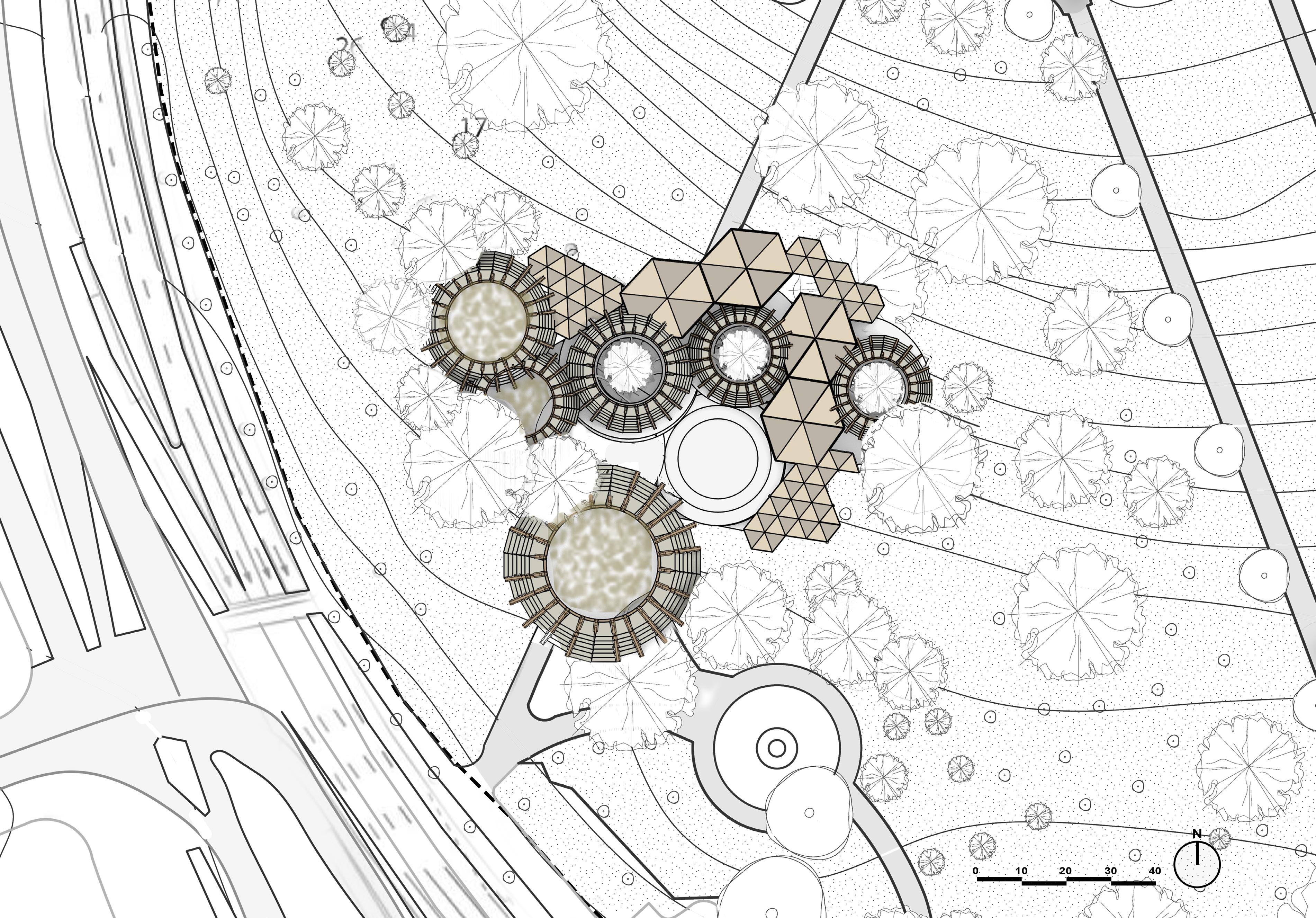 A forest made of trees that is not a forestAfter selecting a gathering point for non-indigenous trees, a circular evolution is created by using the distance between the numbers as the diameter, resulting in a large roof covering a series of artificial tree trunks arranged along the path