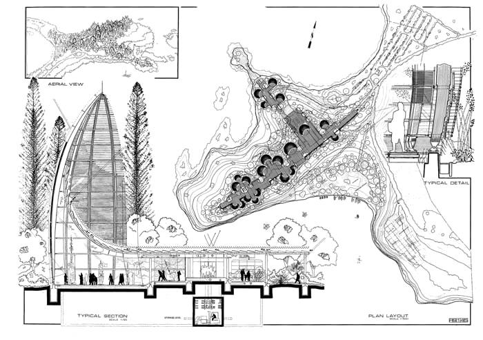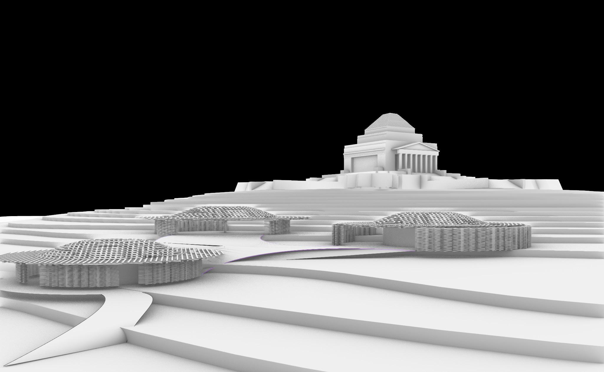 Oversailing them all, and resting on 211 irregularly placed sloping columns, is a steel canopy clad on the underside with zinc metal panels and shaped with a complex geometry reflecting the local landforms.