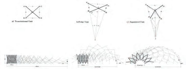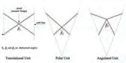 V-shaped bar vertex joints Folding and translation results in the unit line moving at the opposite angle from the original angle