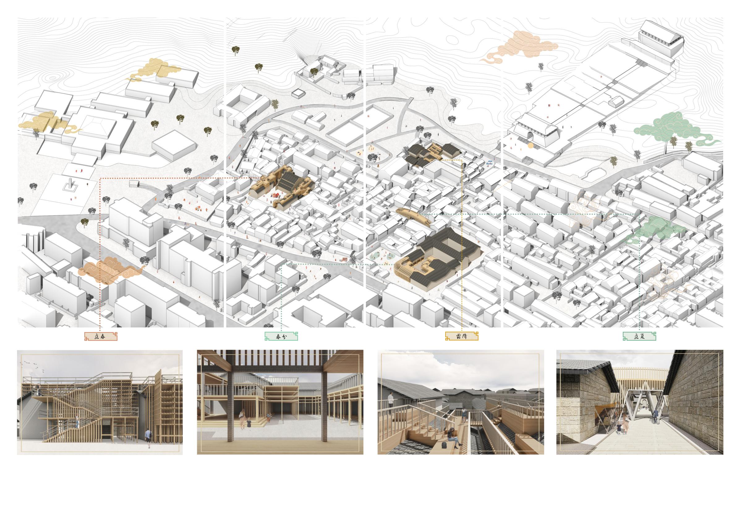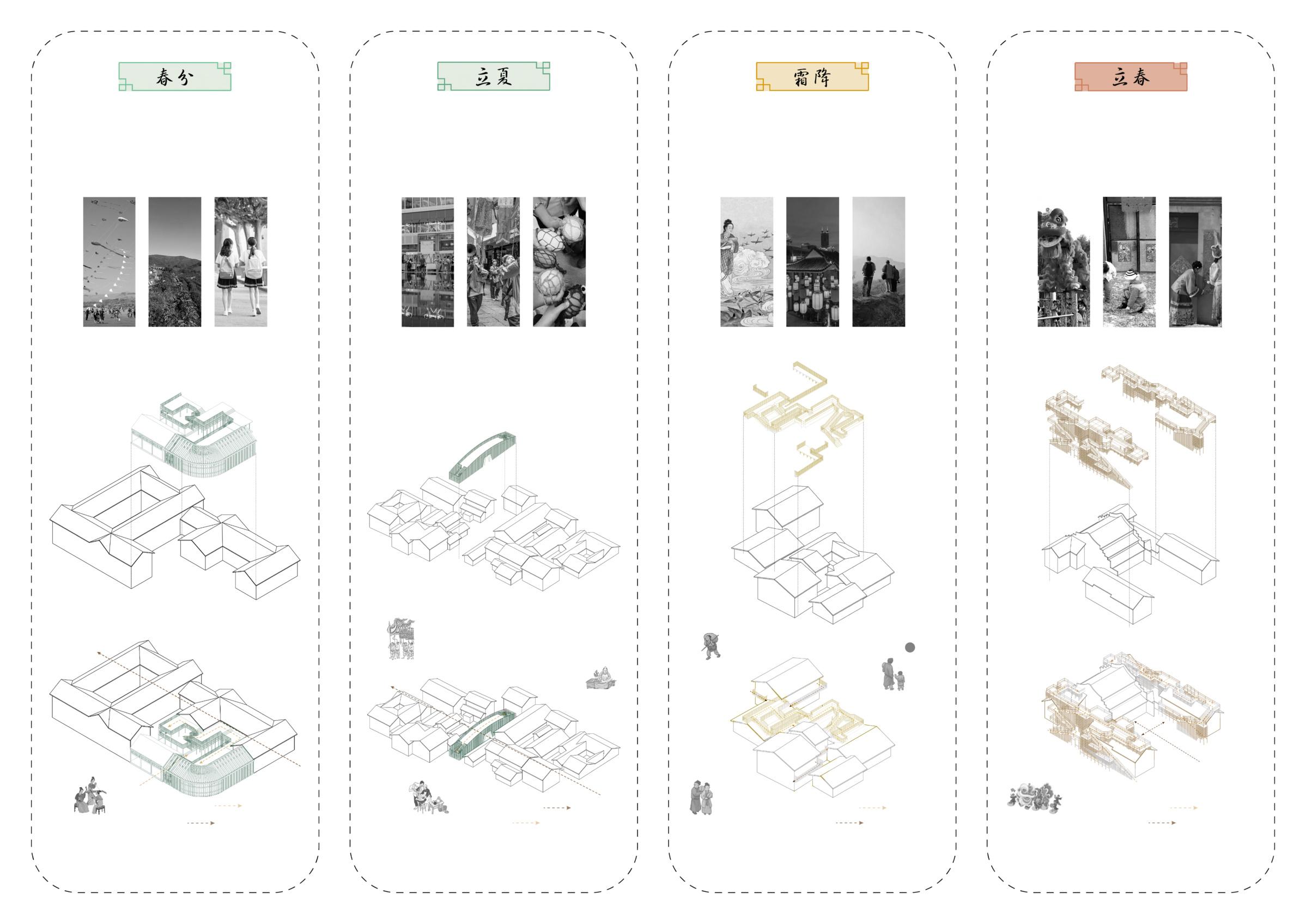 The design of this project focuses on how to use bamboo, a Chinese material, in the renovation of historic buildings. Firstly, I was inspired by the 24 traditional Chinese seasons, from which I selected four of the four seasons. Then, based on the spatial characteristics of the four different nodes of the site, and taking into account the traditional customs of the four seasons, I designed public spaces that can be used by tourists and residents together, so that these four public spaces can bring out the charms of the traditional customs in the different seasons. All the renovations are based on the principles of detachability and sustainability, while fully respecting the historical lineage and providing new ideas for the renovation of other historical buildings in the future.
