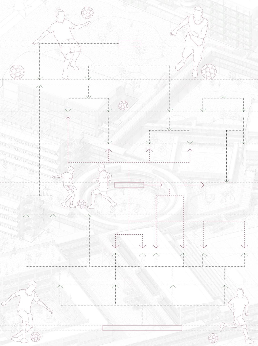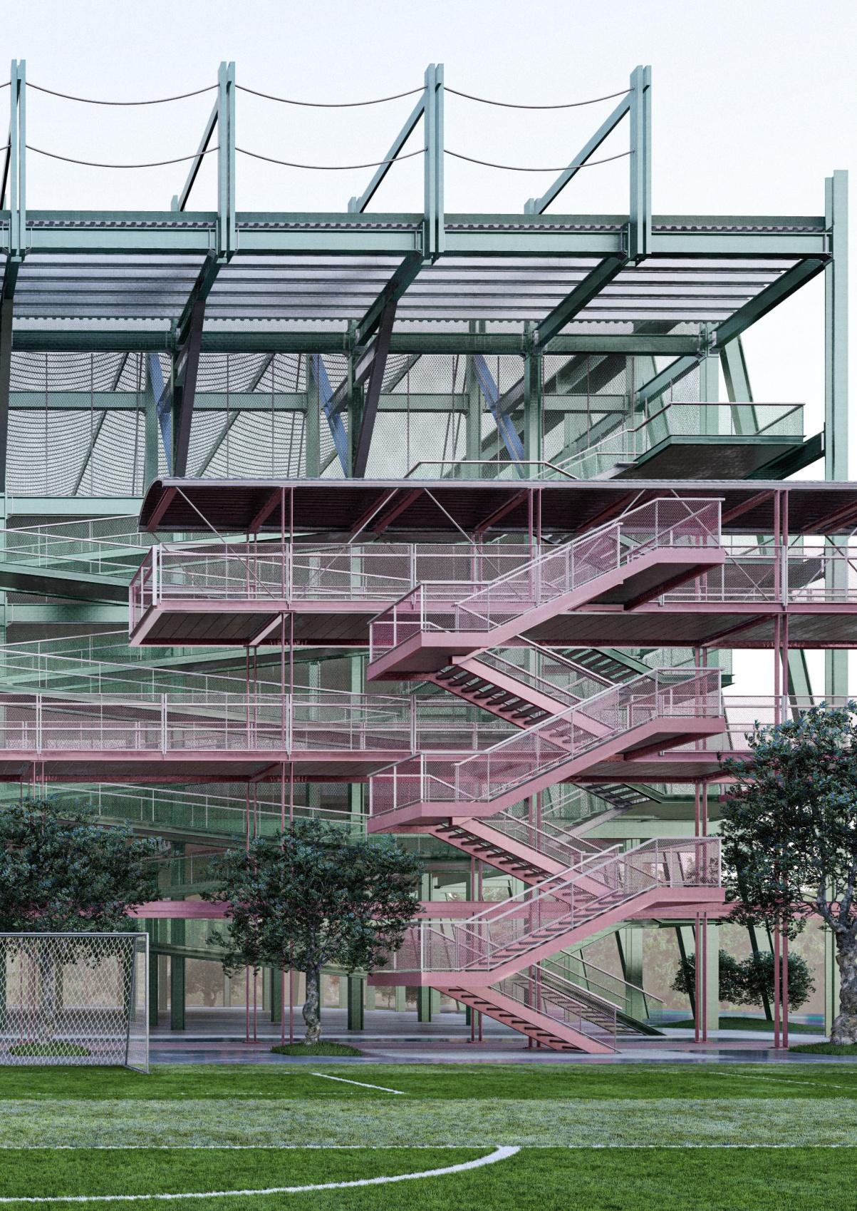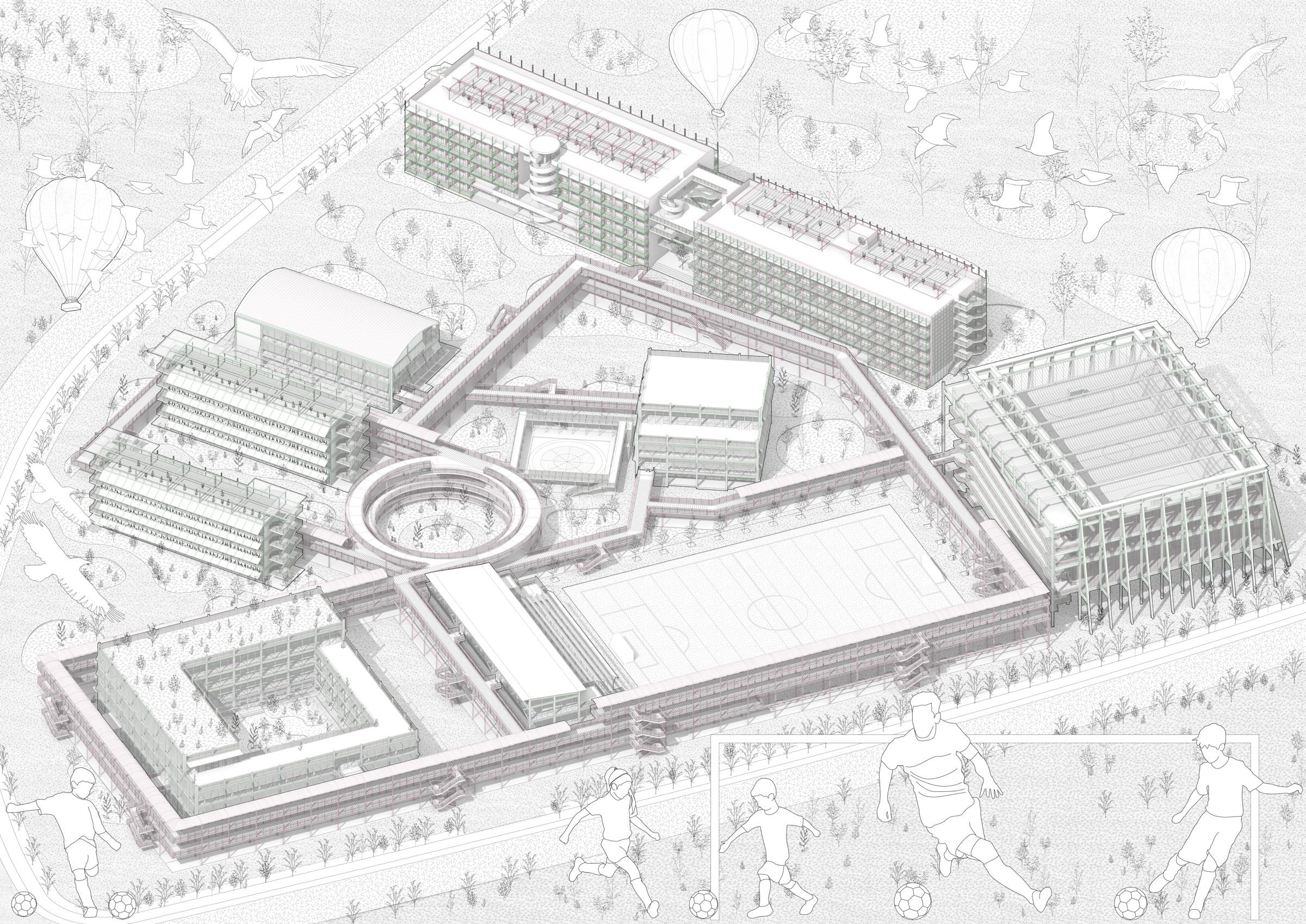In order to alleviate the problems of uneven distribution of resources and weak youth training, the design of this project focuses on breaking the boundaries between traditional training and daily life, integrating elements of life and promoting the all-round development of young people. Youth on campus can not only train on the football field, but also improve themselves through a lifestyle approach. In this project, in addition to the traditional flats, teaching buildings and office buildings, vertical pitches open to the public, diversified stands, and a football honours Gallery have been added. The buildings are connected through air corridors to form an organic and functional campus, allowing the public to engage in perception and imagination about football, and to immerse themselves in the emotional value that football brings to people.