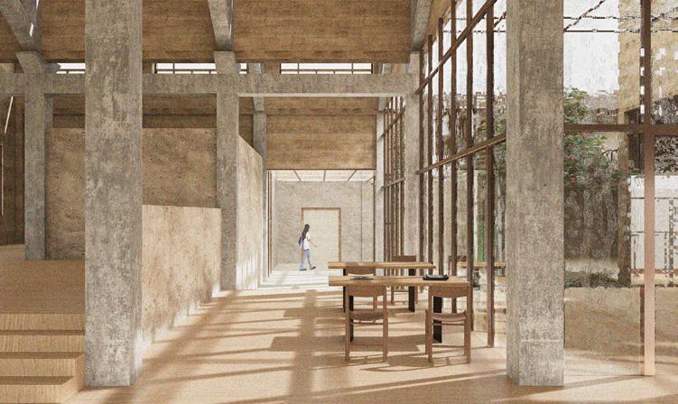 The design of this project focuses on how to place the villagers' society and life into the original factory structure. My approach is to start from the functional needs of the village users, and then through the platform corridor and linear spatial elements, the connection between the various functions of the space is made closer, which increases the diversified exchanges between different groups of people, and thus rejuvenates the spatial vitality of the unused and abandoned factory building. This will revitalise the unused abandoned factory building and create a diversified architectural space for learning, communication, leisure and office.