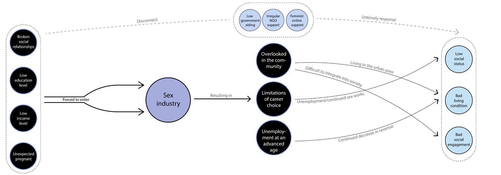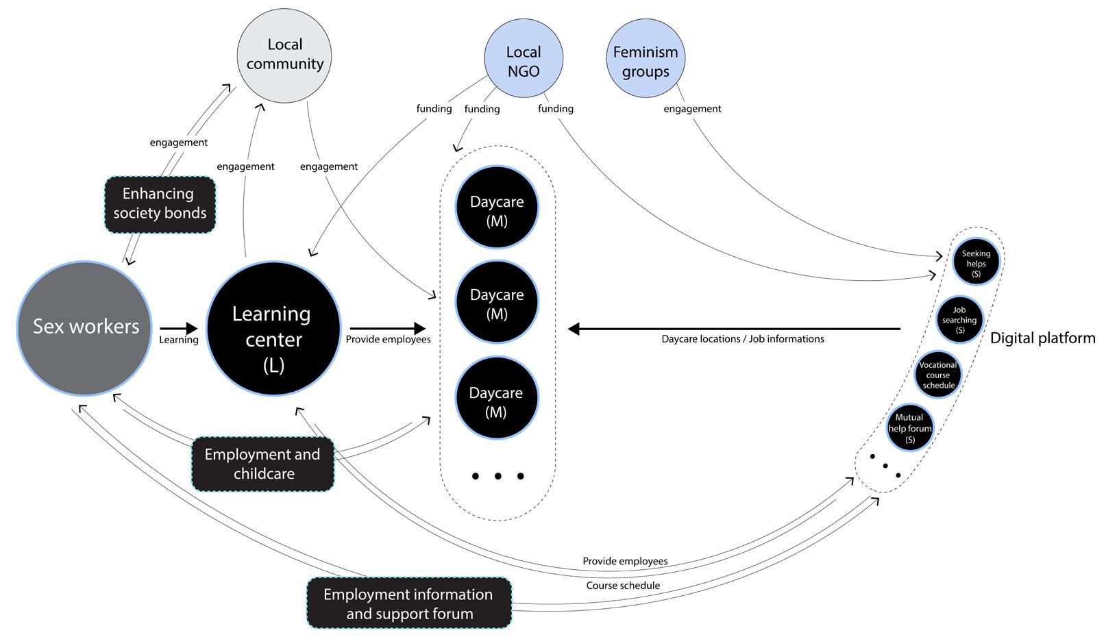After analyzing the reasons and results of women choosing to enter the sex industry, I believe that society should provide them with options to work in other jobs when they want to exit the industry. Then, community centers should be set up to learn skills not far from their daily activities. At the same time, a childcare center interspersed between the fuzokuten place and the community would allow the next generation of sex workers to grow up in an open and healthy environment, and sex workers who have learned professional skills could go to work in the childcare center. An app connects these institutions, and people can check course and employment information through the app. Women who wish to quit the industry can also apply to participate in the maintenance and management of the app.
