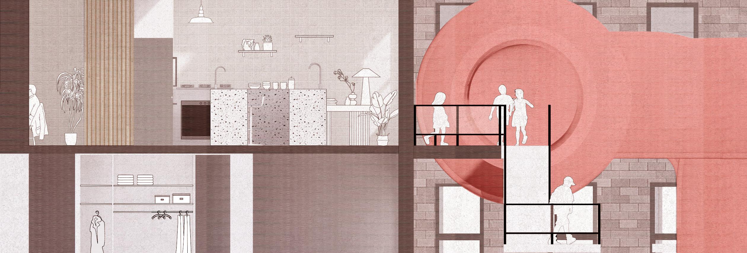 Autistic children with different stages or symptom levels require different treatment methods. This project is a home for a family of children with autism. The pipe rail serves as a connector to open the social channels of autistic children and bring the design of this residential space to more families.