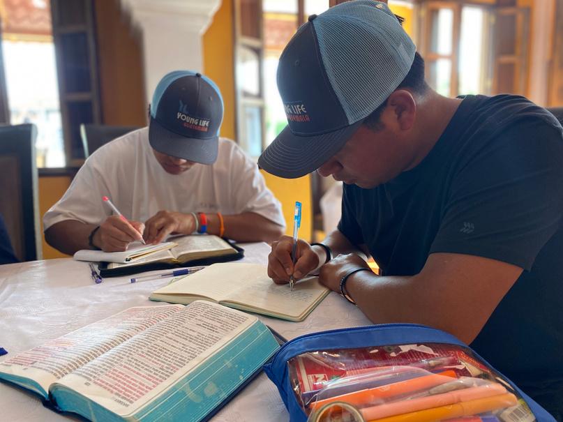 BillyandOsmanarethemain YLvolunteersinSanJuanLaLagunaand Panajachel.Duringourmorningdevotional,theywerebothtaking copiousnotes. Theysaidthisisadisciplinetheyarelearningbecause theywanttobepreparedtoteachonwhatevertheyhavelearned.