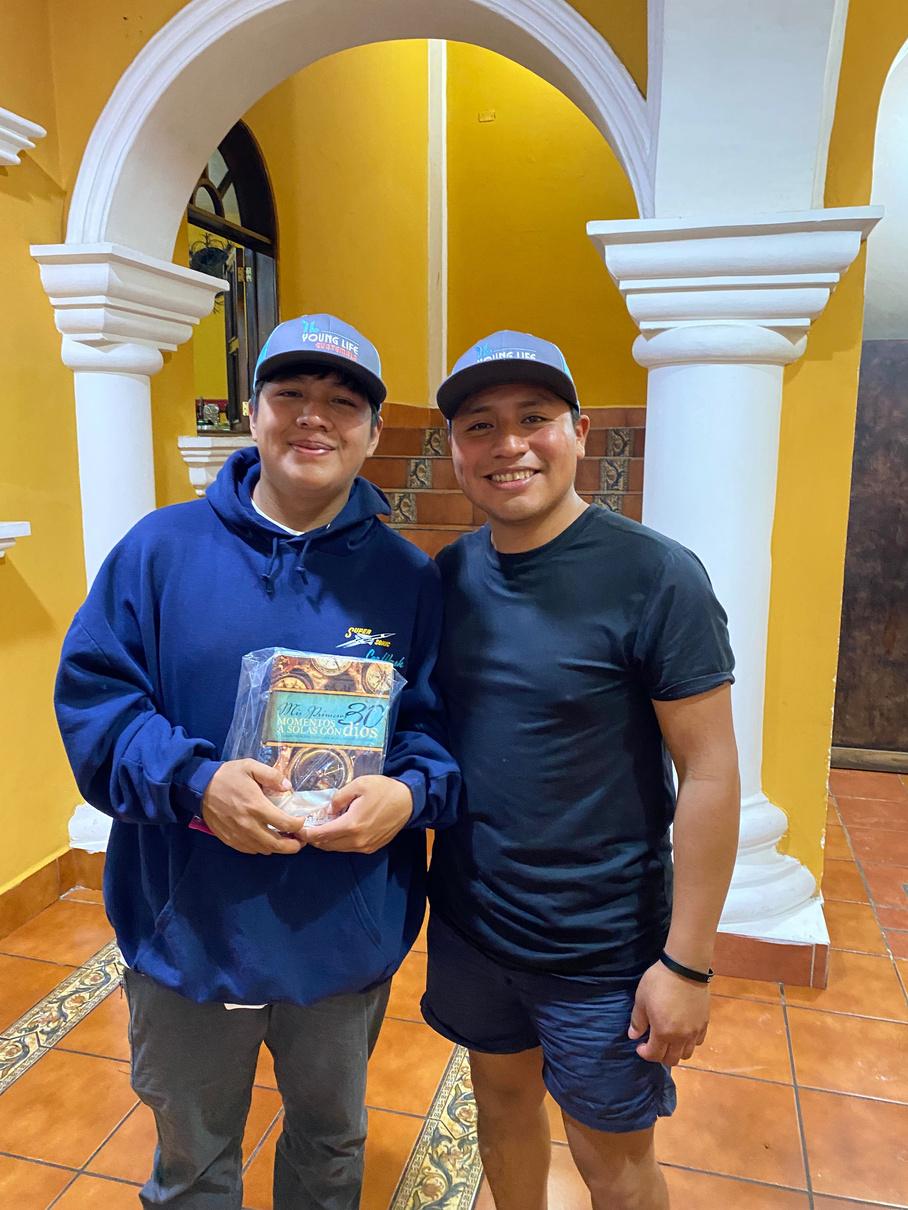 Osman(l)andBilly(r) beamedwhentheyreceived YLGuatemalahatsalongwith25copiesofMyFirst 30QuietTimes(Spanish version),aclassicYoung LiferesourcewrittenbyTySaltzgiver