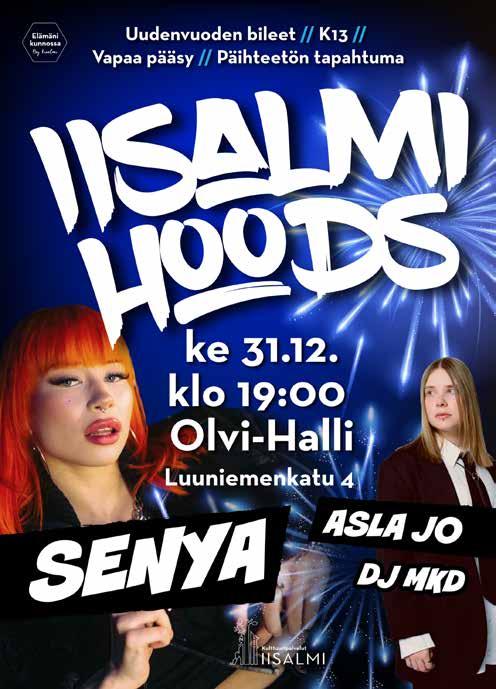 31.12. IISALMI HOODS on tänä vuonna = K13 uudenvuodenbileet Olvi-hallilla! AIKATAULU klo 19 ovet DJ MKD, klo 19.45 ASLA JO, klo 22.30 DJ MKD, klo 21 SHRTY, klo 22.30 ILOTULITUS!