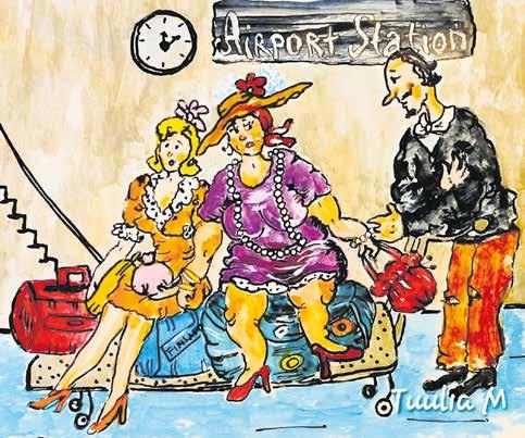 Onneksi lento oli aikataulussa ja he pääsivät passintarkastuksen jälkeen astelemaan kohti matkustajakonetta. Iloisena Sanelma ja Rannan Maija vilkuttivat miehelle, joka jäi haikeana katsomaan heidän peräänsä. Avulias apumies toivoi kovasti näkevänsä naiset uudelleen, kun he palaisivat lomaltaan.
