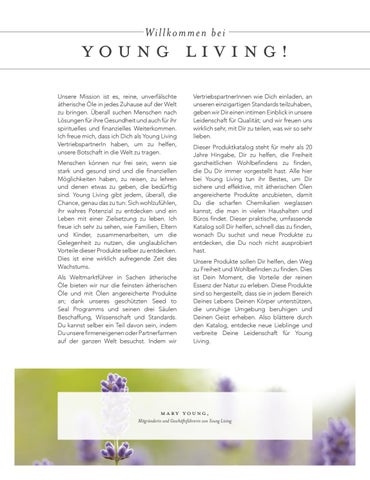 VertriebspartnerInnen wie Dich einladen, an unseren einzigartigen Standards teilzuhaben, geben wir Dir einen intimen Einblick in unsere Leidenschaft für Qualität; und wir freuen uns wirklich sehr, mit Dir zu teilen, was wir so sehr lieben. Dieser Produktkatalog steht für mehr als 20 Jahre Hingabe, Dir zu helfen, die Freiheit ganzheitlichen Wohlbefindens zu finden, die Du Dir immer vorgestellt hast. Alle hier bei Young Living tun ihr Bestes, um Dir sichere und effektive, mit ätherischen Ölen angereicherte Produkte anzubieten, damit Du die scharfen Chemikalien weglassen kannst, die man in vielen Haushalten und Büros findet. Dieser praktische, umfassende Katalog soll Dir helfen, schnell das zu finden, wonach Du suchst und neue Produkte zu entdecken, die Du noch nicht ausprobiert hast. Unsere Produkte sollen Dir helfen, den Weg zu Freiheit und Wohlbefinden zu finden. Dies ist Dein Moment, die Vorteile der reinen Essenz der Natur zu erleben. Diese Produkte sind so hergestellt, dass sie in jedem Bereich Deines Lebens Deinen Körper unterstützen, die unruhige Umgebung beruhigen und Deinen Geist erheben. Also blättere durch den Katalog, entdecke neue Lieblinge und verbreite Deine Leidenschaft für Young Living.
