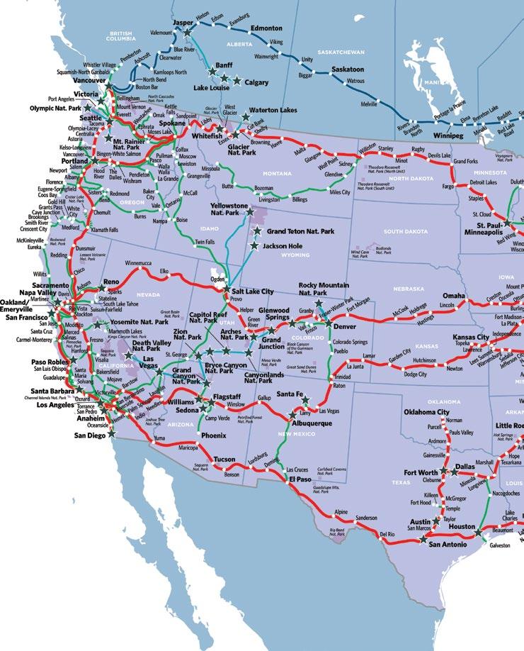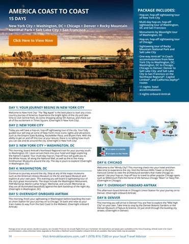 • One-way Amtrak® in Coach accommodations from Chicago to Salt Lake City; Salt Lake City to San Francisco; San Francisco to Los Angeles; Los Angeles to Williams; Williams to Chicago in Coach accommodations on the California Zephyr®, Coast Starlight®, and Southwest Chief®