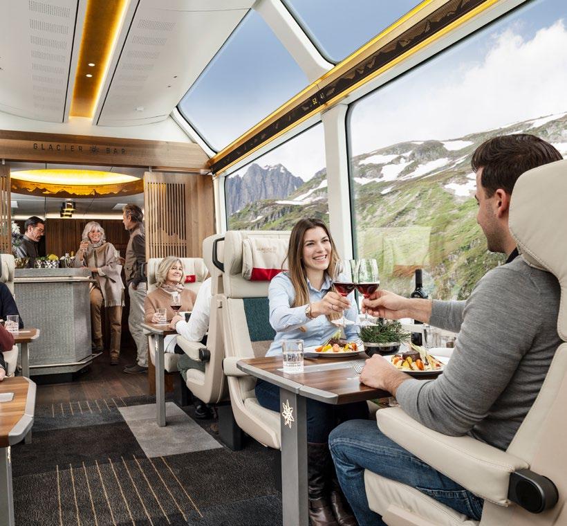 Never before has a rail journey through the Swiss Alps been so luxurious. With exclusive and guaranteed window seats, an exclusive bar, on-board entertainment, a concierge service and personal travel guides, the Glacier Express Excellence Class is setting new standards. Passengers are served champagne – followed by an exquisite six-course meal with accompanying wine.