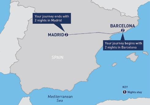 Enjoy breakfast in Barcelona before checking out of your hotel and making your way to the railway station, where you’ll catch a high-speed train to Madrid. On arrival, check in at your hotel for a twonight stay. In the afternoon, why not take a stroll around the impressive Buen Retiro Park, one of the largest parks in all of Madrid, and a wonderful spot for people-watching, architecture spotting and even boating on the shimmering lake? Later, you may wish to enjoy a drink along the Paseo de la Castellana or maybe the Gran Via, an elaborate and upmarket shopping street, known as the ‘Spanish Broadway’.