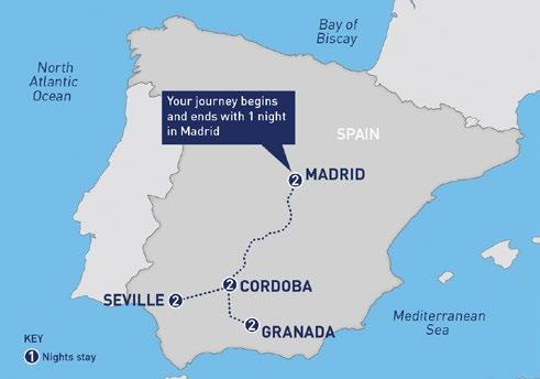 After breakfast, explore one of Spain’s most celebrated historic monuments on a guided tour of the Great Mosque Cathedral of Córdoba. Hear the fascinating history of this UNESCO World Heritage site from a local guide and marvel at the wellpreserved architecture from many eras of Córdoban history.