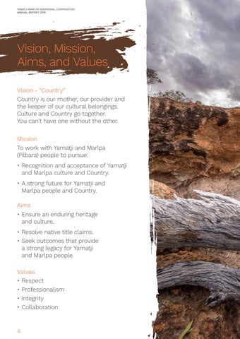 Vision, Mission, Aims, and Values Vision - “Country” Country is our mother, our provider and the keeper of our cultural belongings. Culture and Country go together. You can’t have one without the other. Mission To work with Yamatji and Marlpa (Pilbara) people to pursue: • Recognition and acceptance of Yamatji and Marlpa culture and Country. • A strong future for Yamatji and Marlpa people and Country. Aims • Ensure an enduring heritage and culture. • Resolve native title claims. • Seek outcomes that provide a strong legacy for Yamatji and Marlpa people. Values • Respect • Professionalism • Integrity • Collaboration