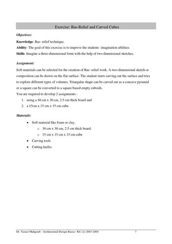 Exercise: Bas-Relief and Carved Cubes Objectives: Knowledge: Bas- relief technique. Ability: The goal of this exercise is to improve the students imagination abilities. Skills: Imagine a three-dimensional form with the help of two-dimensional sketches. Assignment: Soft materials can be selected for the creation of Bas- relief work. A two-dimensional sketch or composition can be drawn on the flat surface. The student starts carving out the surface and tries to explore different types of volumes. Triangular shape can be carved out as a concave pyramid or a square can be converted to a square based empty cuboids. You are required to develop 2 assignments : 1. using a 03 cm x 30 cm, 2.5 cm thick board and 2. a 51cm x 15 cm x 15 cm cube. Materials: