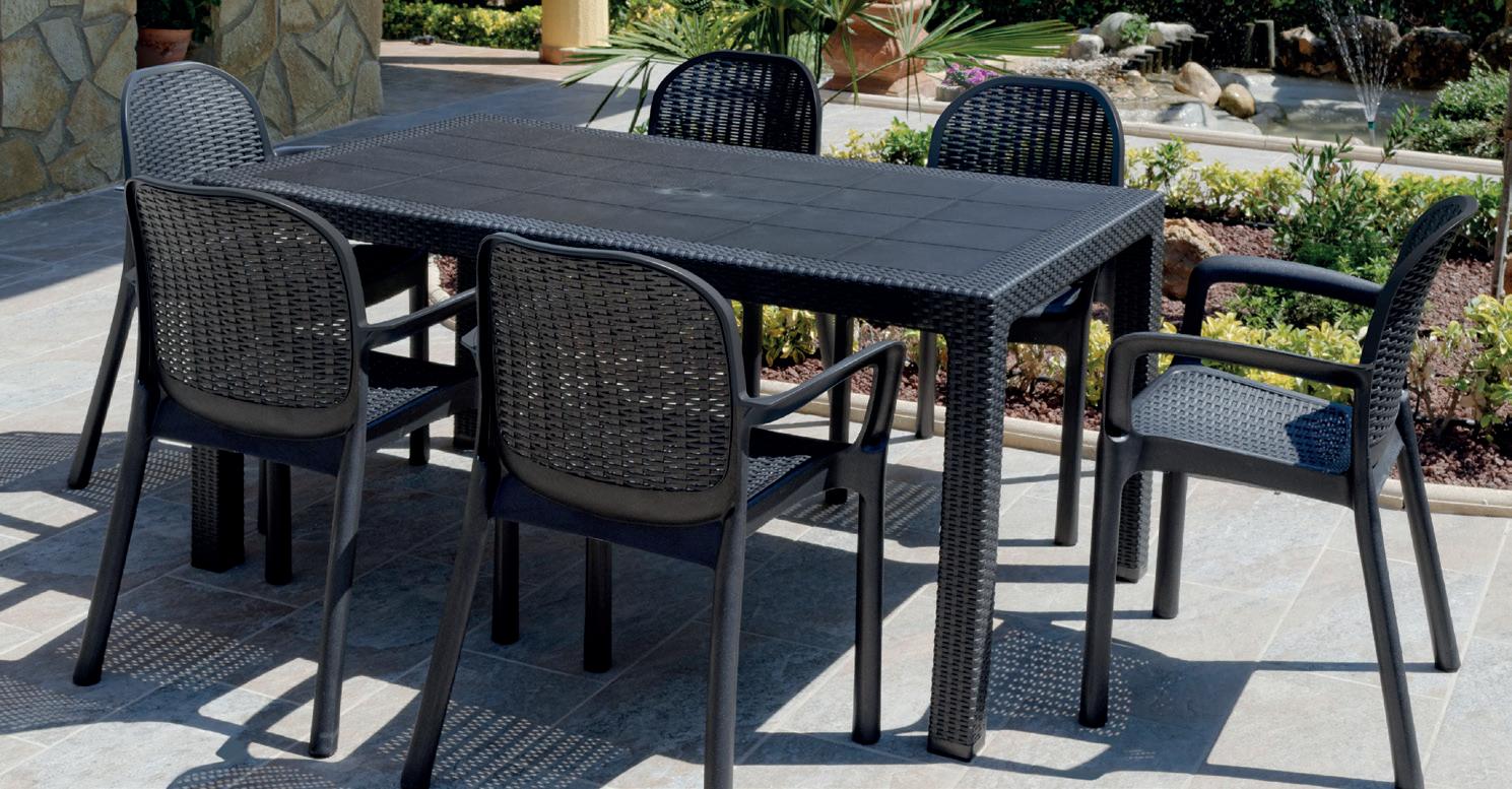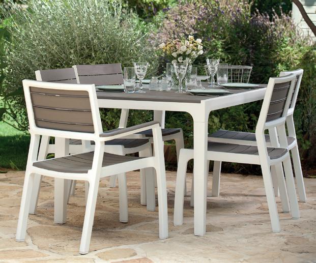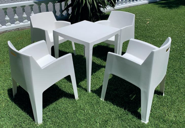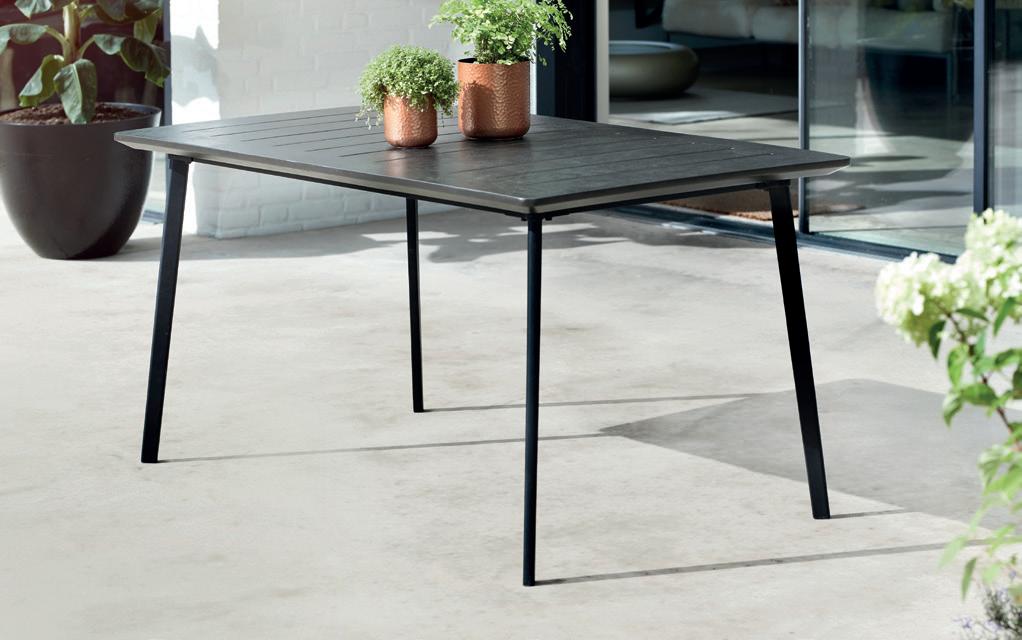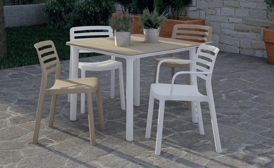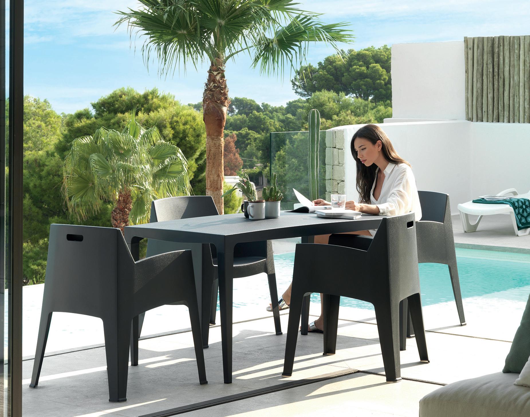 Mesa de jardín de diseño minimalista perfecta para usar tanto en exterior como en interior, de gran versatilidad, puede combinar con cualquier tipo de silla. Fácil de montar. Resistente a los rayos UV. Fabricación 100% España utilizando hasta un 70% de material reciclado de