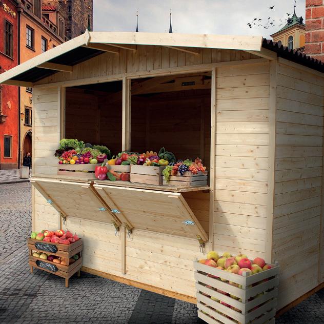 Caseta laia kiosco de madera 17 mm panelada con mostrador, ventana abatible, suelo, tejado impermeable, puerta lateral con cierre - 8,84 m2 - medidas exteriores 336 x 263 x 232 cm.
