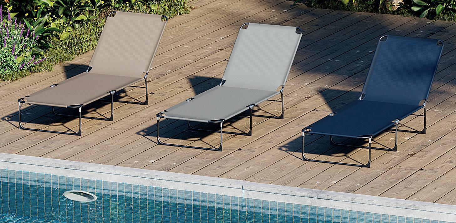 Gris oscuro, estructura en acero pintado de alta resistencia al exterior y textilene.