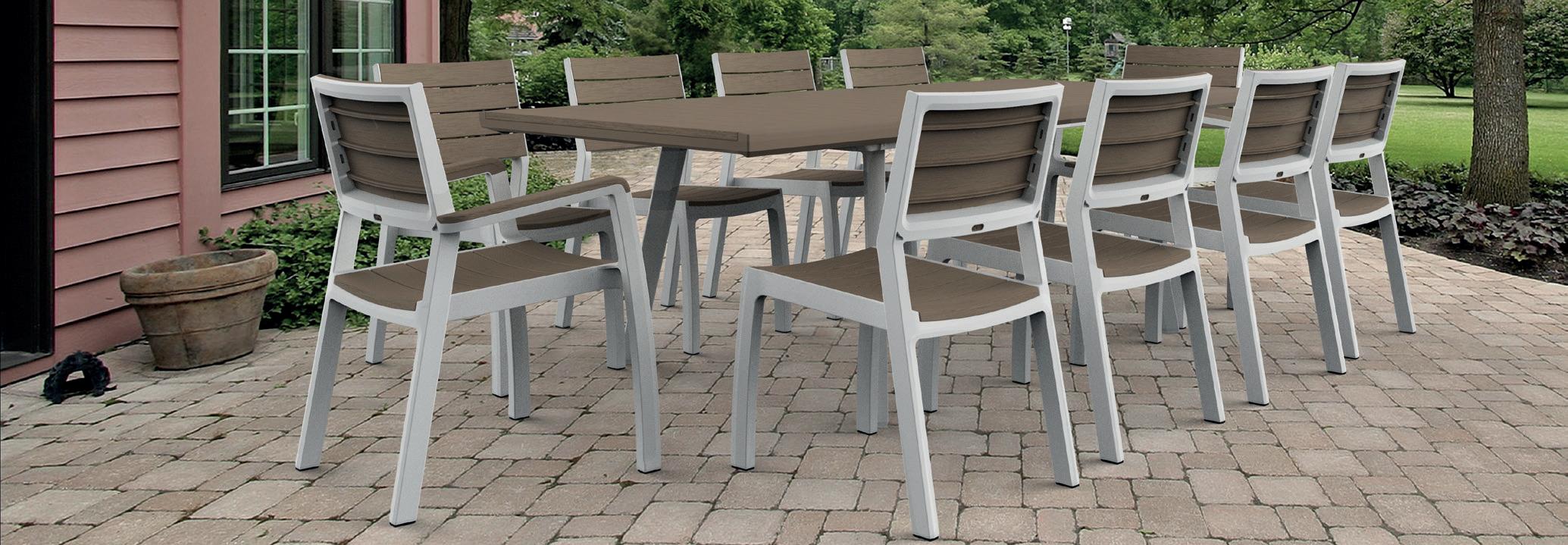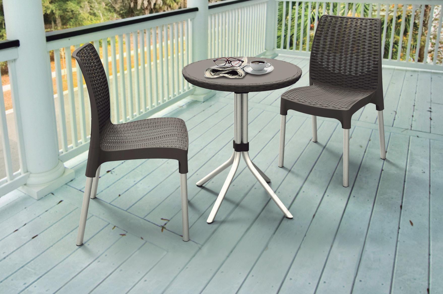 Resina tratada para uso exterior, bajo mantenimiento. Simulación aluminio y madera. Elegante diseño gracias a su textura efecto madera color capuchino y patas de color blanco. Sillas muy cómodas, elegantes y resistentes.
