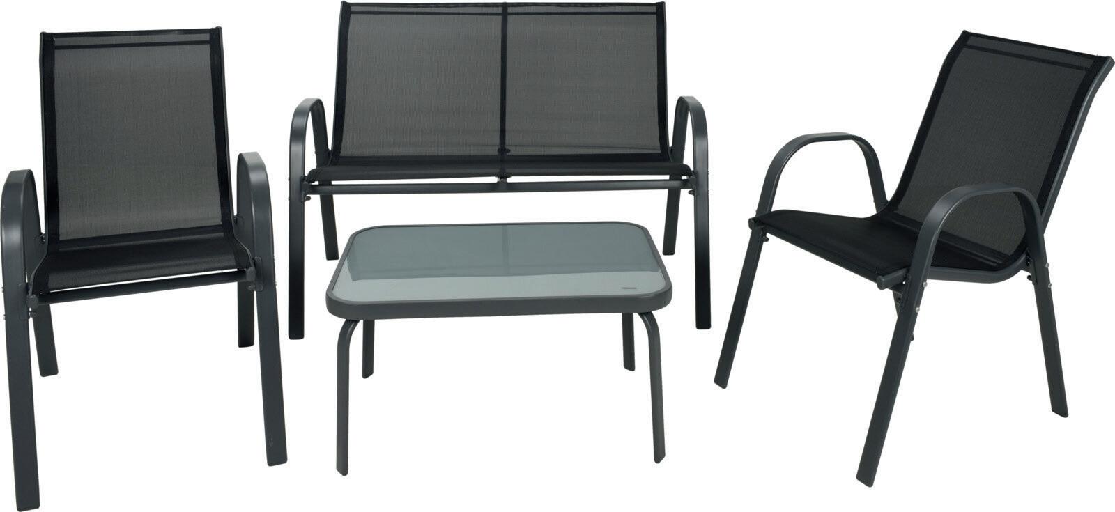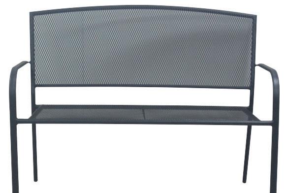Color gris grafi to, 4 piezas: 2 sillas individual acero/poliester: 64x55x81cm, 1 banco doble asiento acero/poliester: 66,5x114x78,5cm, 1 mesa: 71x51x36,5cm, tubo de acero 42x14mm, y sobre de cristal templado 5mm.