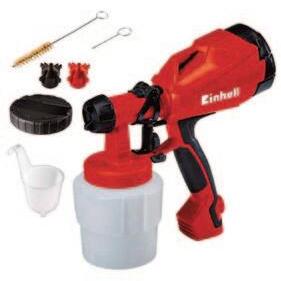 EINHELL TC-SY 400 P 400 W. Incluye 2 boquillas para diferentes viscosidades. Cepillo y aguja de limpieza para el tubo vertical y la boquilla de pulverización. Contenedor de 800 ml con escala de medición.