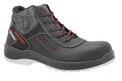 Piel velour roja hidro-repelente. Suela Flat Grip efecto neumático, con horma especial para conducir. Puntera composite y plantilla antiperforación de fibras cerámicas Zero. 100% libre de metal. Made in CE. Homologación CE EN 345 S3 ESD SRC.