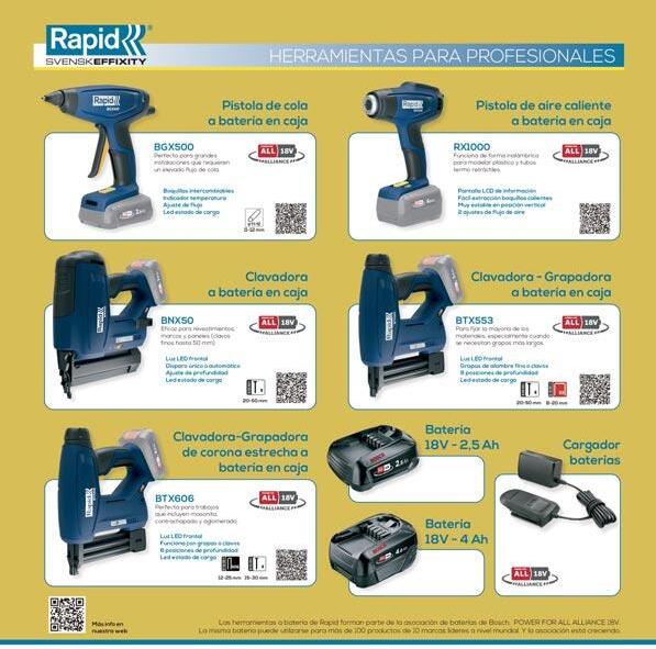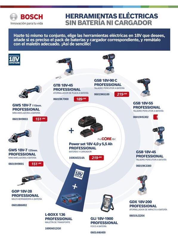 PARA SER TODO UN PROFESIONAL 2 BOSCH 3 HERRAMIENTA ELECTROPORTÁTIL 4 Atornilladores, taladros, martillos, amoladoras, sierras, cepillos ... Accesorios: brocas, discos ... HERRAMIENTA MANUAL 10 Juegos de herramientas, llaves, vasos, puntas, destornilladores, tenazas ... OBRA CONSTRUCCIÓN 13 Talochas, llanas, palas, plataformas, cortadores profesionales, polipastos, mezcladores ... SEÑALIZACIÓN OBRA 16 Mallas, conos, carteles ... SOLDADURA 18 Sopletes, pantallas, grupos ... HERRAMIENTA NEUMÁTICA 20 Compresores, clavadoras, pistolas ... ILUMINACIÓN ELECTRICIDAD 22 Focos, cuadros, balizas, bases ... MEDICIÓN Y DETECCIÓN 24 Calibres, topómetros, cintas, medidores, niveles, comprobadores ... ESCALERAS CARRETILLAS 26 ORDEN ORGANIZACIÓN 28 LIMPIEZA PROFESIONAL 29 HERRAMIENTA PODA JARDINERÍA 30 Bombas de agua, tijeras, serruchos, cortasetos, motosierras, sopladores ... ADHESIVOS QUÍMICOS 35 Pegamentos, siliconas, espumas, masillas, anclajes, selladores ... GRASAS LUBRICANTES 40 PROTECCIÓN LABORAL EPIs 42 Arneses, cascos, rodilleras, guantes ... VESTUARIO CALZADO LABORAL 46 Cazadoras, pantalones, alta visibilidad, zapatos, botas ... RAPID 52