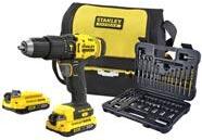 TALADRO PERCUTOR V20 STANLEY Par máximo de 50 Nm. Portabrocas 13 mm. 22 posiciones de par de apriete. Incluye: Set 50 piezas, 2 baterías Li-Ion 2Ah. Bolsa transporte.