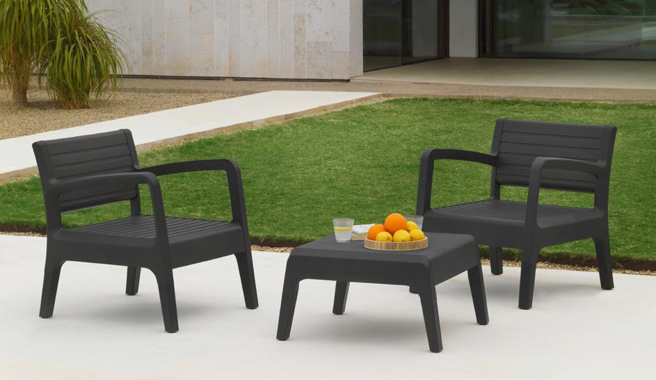 Fabricacion 100% España. Resistente a la intemperie, protección UV. Facil limpieza. Silla: 62x69x72cm. Mesa: 35x66x62cm.