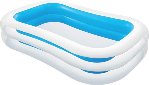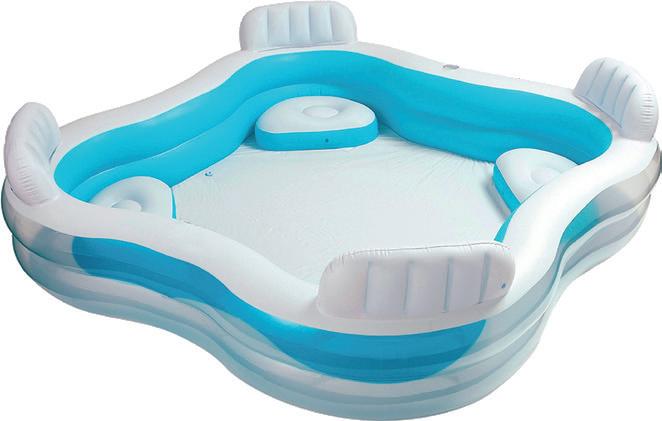 229x229x60 cm. Capacidad 990L. 4 asientos con respaldo, 2 portabebidas y tapón de vaciado. Fabricada en vinilo de 0.32 mm de grosor. Para mayores de 3 años.