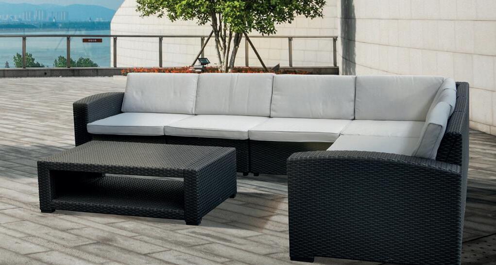 Imitación ratan formado por: 1 sofá rinconera 4 plazas (263x71x75cm.)+ 1 sofá rinconera 3 plazas (201x71x75cm.)+ mesa (93x56x38,5cm.). Cojinera el poliespuna color gris claro con funda de poliéster.