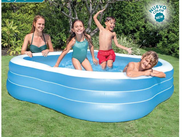 229x229x56 cm. Capacidad de 1205L. Para 3 o 4 niños a partir de 6 años. Tapón de vaciado con conexion a una manguera de jardín.