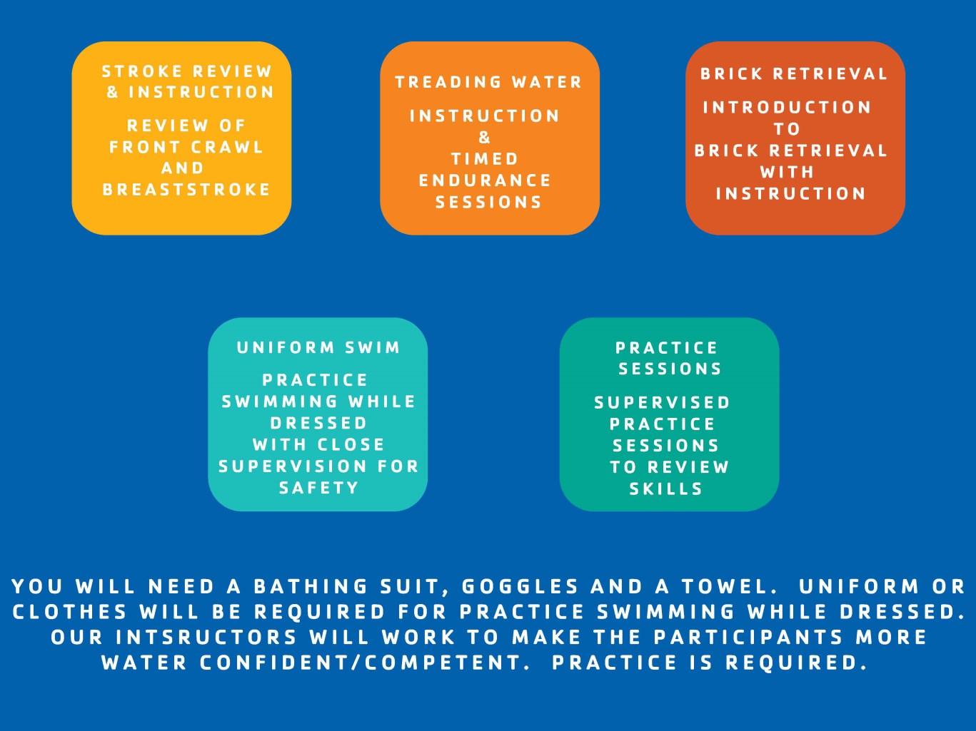 Participants also learn to retrieve a 10lb brick from a depth of 9 feet, tread with the brick, and swim using either sidestroke or backstroke while holding the brick for a distance of 25 yards. The completion of the course culminates with participants swimming at least 50 yards, completing a brick retrieval and a 5-minute tread while fully dressed.