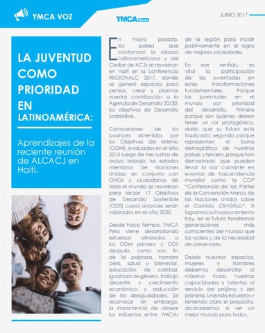 n mayo pasado, los países que conforman la Alianza Latinoamericana y del Caribe de ACJs se reunieron en Haití en la conferencia REGIONALC 2017, donde se generó espacios para pensar, crear y plasmar nuestra contribución a la Agenda de Desarrollo 20/30, los objetivos de Desarrollo Sostenible. Conocedores de los avances obtenidos por los Objetivos del Milenio (ODM), evaluados en el año 2015 luego de tres lustros de arduo trabajo; los estados miembros de Naciones Unidas, en conjunto con ONGs y ciudadanos de todo el mundo se reunieron para lanzar 17 Objetivos de Desarrollo Sostenible (ODS) cuyos avances serán valorados en el año 2030. Desde hace tiempo, YMCA Perú viene desarrollando esfuerzos alineados a los ODM primero y ODS después, como son: fin de la pobreza, hambre cero, salud y bienestar, educación de calidad, igualdad de género, trabajo decente y crecimiento económico y reducción de las desigualdades. Se reconoce sin embargo, la importancia de alinear los esfuerzos entre YMCAs