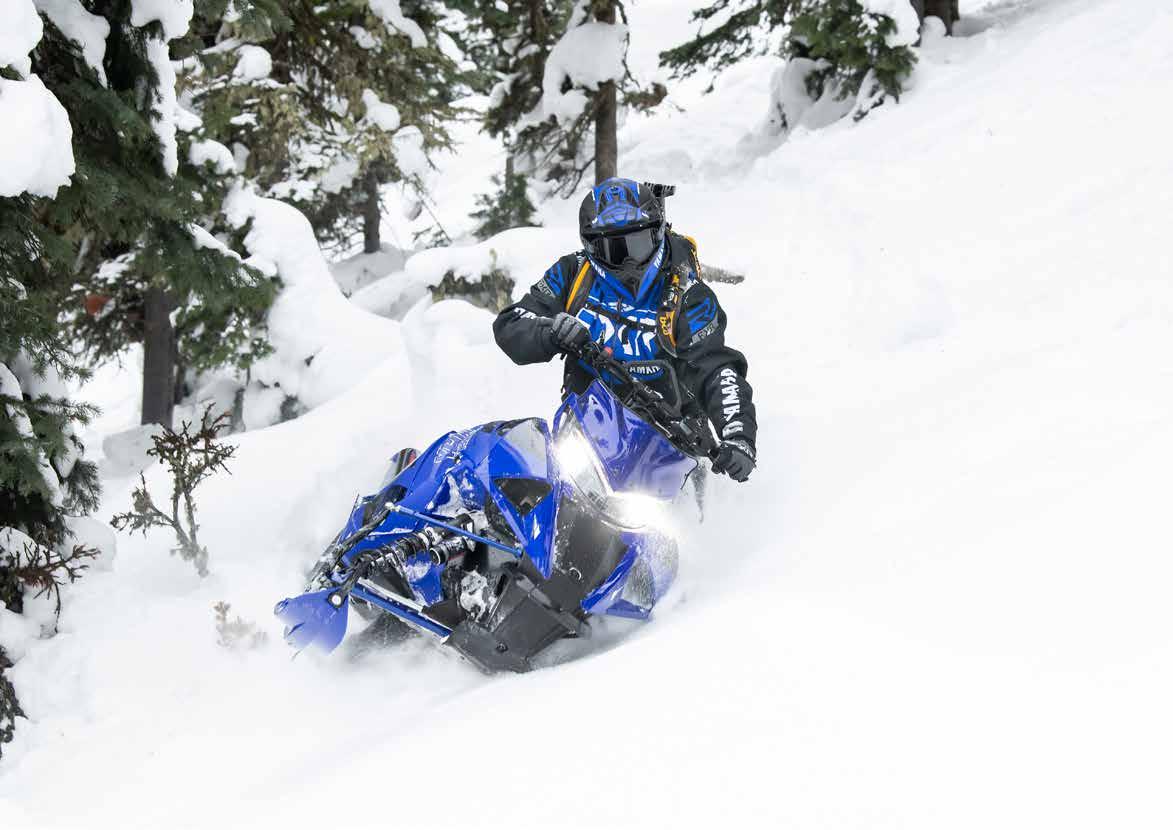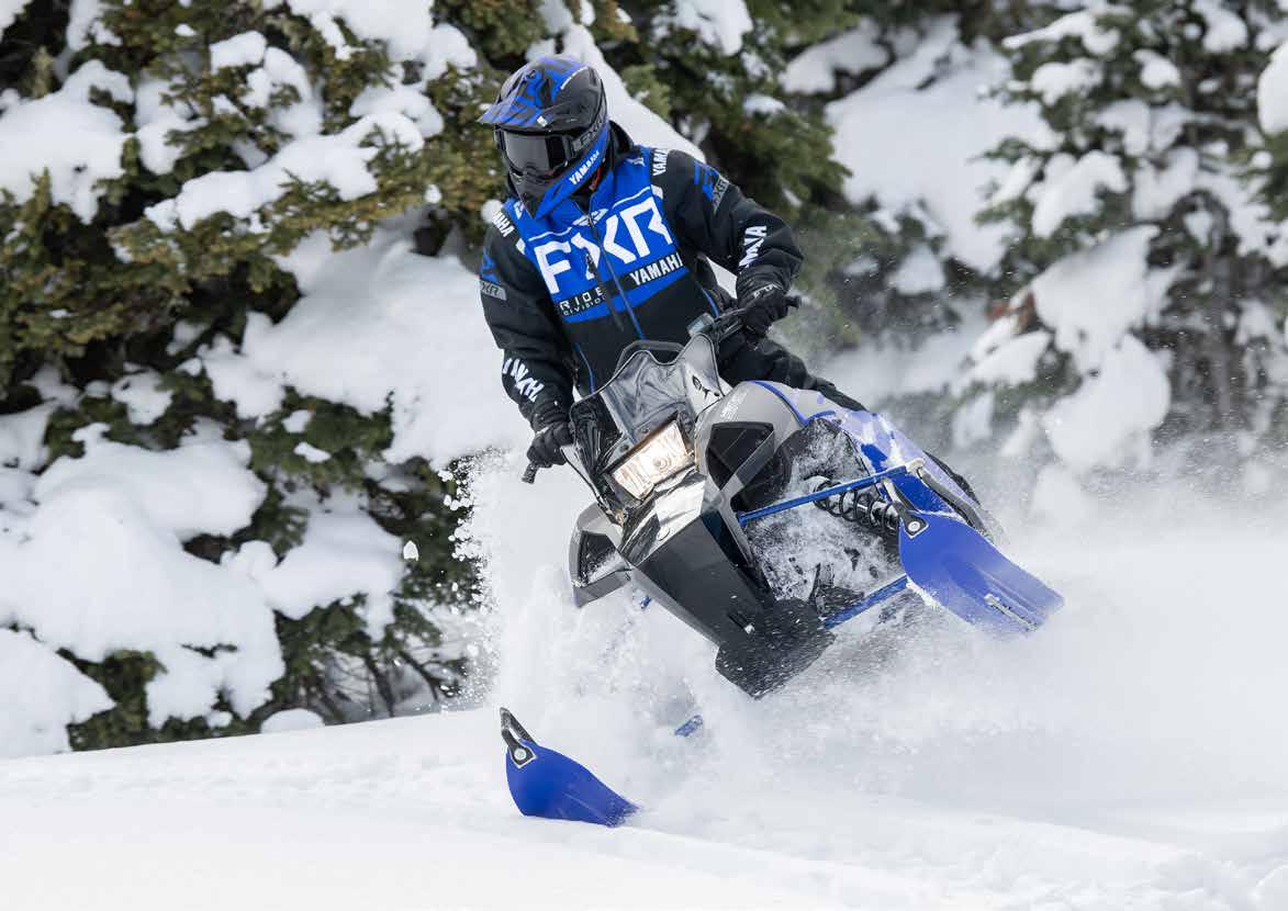 Snowmobiles are built to operate within their design limits. For durability, reliability, but most important of all, operator safety, under no circumstances should the recommended capacities identified in the owner’s manual be exceeded. Consult your snowmobile dealer when selecting a snowmobile for your particular needs. Always wear a helmet, eye protection and protective clothing. Yamaha encourage you to ride safely and respect fellow riders and the environment. Images shown in this brochure depict professional riders performing under controlled conditions. Specifications and appearance of Yamaha products as shown here are subject to change without notice and may vary according to requirements and conditions. Some models are shown with optional accessories.