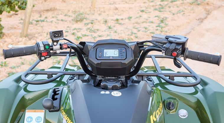 The Kodiak 700 EPS features a digital meter with a fuel gauge, speedometer, odometer, dual trip meters, hour meter, clock, 4WD status, gear selector and EPS warning light