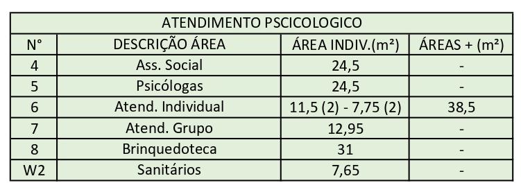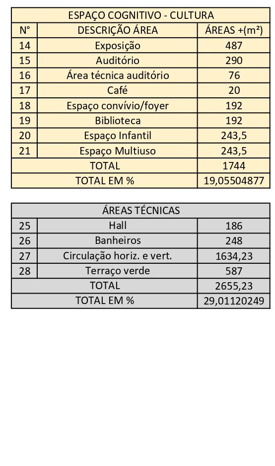 Sala de Atend. Imediato 1 17 Lojas Interna de Empoderamento 1 15 Hall de Espera 1 43 Sala de Atend. Psico. Individual 2 16,5 Alojamento 2373,4 Cultural Educacional 2378,4 Setor Ambiente QuantidadeMetragem (m²)Total (m²) Habitação Tipo 1 8 13,4 Habitação Tipo 2 6 14,45 Habitação Tipo 3 4 20 Habitação Tipo 4 4 18,8 Ambiente Sensorial 3 63 Sala de TV - Coletivo 1 26,7 Cozinha Coletiva 1 24,2 Refeitório Coletivo 1 69 Refeitório Infantil 1 31,65 Lavanderia Coletiva 1 24,15 Sala de Creche 4 28 Espaço de Recreação Infantil Coberto 1 47 Berçário 1 24,05 Fraldário 1 8,55 Sala de Amamentação e Lactário 1 27,2 Térreo Elevado - espaço de estar, mesas e playground 1 700 DML/Rouparia 3 13,3 Academia 1 110 WC 01, 02 e 026 - 14,3 - 4,3 Circulação 30%547,71 Recepção 1 23,3 Hall de espera e controle de estrada 1 14,3 Espaço de Convívio Coberto1 177 Espaço de Exposição Interno2 22 Biblioteca 1 74 Sala de Oficinas 2 35 Oficina de Marcenaria1 43,3 Oficina de Artesanato1 37,5 Estamparia de Tecido1 31,9 Oficina de Jardinagem 1 195 Oficina de Pintura 1 45,3 Sala de Informática 2 33 Manufatura de Bijuterias 1 36,8 Sala Multiuso 1 33 Oficina de Coral 1 33 Oficina de Dança 1 78,5 Espaço de Empoderamento 1 145 Ateliê Livre + Espaço de Exposição Interno 1 145,5 Comercio colaborativo 1 32,65 Auditório - 126 pessoas 1 242,5 Foyer Interno 1 80,5 Foyer Externo 1 59 Coxia 1 70 Camarim 1 100 Vestiário/WC Camarim 1 34 Área técnica som (auditório) 1 19,6 WC 3 e 216 e 5,2 Circulação 30%397,815 Sala de Atend. Imediato 1 17 Lojas Interna de Empoderamento 1 15 Hall de Espera 1 43 Sala de Atend. Psico. Individual 2 16,5 Alojamento 2373,4 Cultural Educacional 2378,4 Camarim 1 100 Vestiário/WC Camarim 1 34 Área técnica som (auditório) 1 19,6 WC 3 e 216 e 5,2 Circulação 30%397,815 Sala de Atend. Imediato 1 17 Lojas Interna de Empoderamento 1 15 Hall de Espera 1 43 Sala de Atend. Psico. Individual 2 16,5 Sala de Atend. Psico. Infantil2 16,5 Sala de Atend. Psico. Coletivo1 25 Atendimento Social 2 17 Atendimento Jurídico 2 13 Enfermaria 1 21,5 Sala de Medicação 1 14,7 WC 2 14,5 - 4 Circulação 30% 84,21 Sala Psicóloga e Assistente Social 1 38,3 Sala de Monitoramento e Atend. Virtual 1 27,4 Sala da Defensoria Pública1 35 Sala de Reunião 2 15,5 Sala do Financeiro e RH 1 16,4 Sala Coordenação 1 13,25 Vestiário 1 26,9 Copa e Descompressão 1 51,3 Sala de Transporte Interno 1 80 DML distribuidos nos pavs 2 7 WC 1 13,9 Depósito 1 52,1 Bicicletário 1 25,1 Área para Compostagem 1 51,5 Separação de lixo e reciclagem 1 61,9 Área de Tratamento de Capitação e Reuso da Água 1 75,8 Circulação 30% 184,155 5914,7 TOTAL Atendimento Psicossocial e Jurídico 364,9 798 Administração