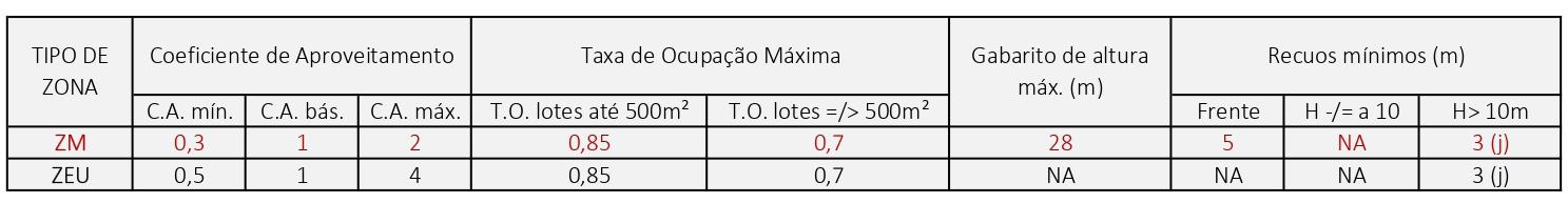 A implantação está localizada em uma Zona Mista (ZM) e em torno de uma Zona de Estruturação Urbana (ZEU), as tabelas mostram os índices com os parâmetros de ocupação de lotes, utilizados como base projetual e analise de como será a futura característica do entorno, indicando que a área vai adensar muito nos próximos anos e ter uma verticalização significante, diferente do cenário atual. Assim como o uso e ocupação do solo, em grande parte uso residencial ou misto.