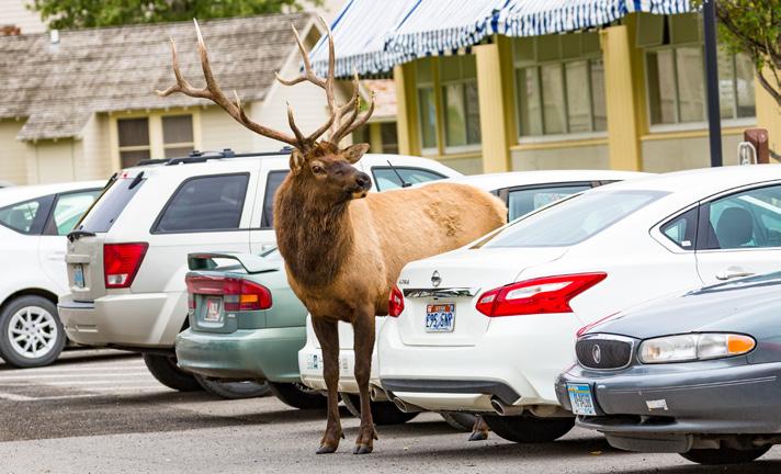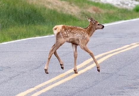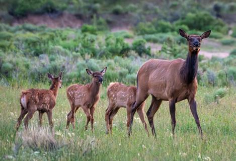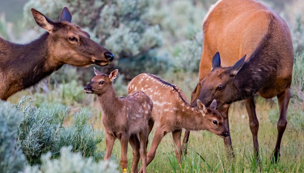 Elk are abundant in Yellowstone with approximately 20,000 calling the park home in the summer months. These herds are especially active during the rut (mating season) when the bulls (males) bugle to attract cows (females) and fight off other males in intense battles. Each spring, cow elk may birth a single calf. Calves are born with brown fur and white spots that provide good camouflage. Calves can walk within one hour of being born, but they spend much of their first week of life bedded down, as cow elk hide their newborns to protect them from predators.