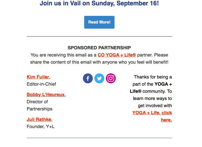 Friday PARTIALLY SPONSORED NEWSLETTERS are $250 for a sponsored inclusion of your business, event, offering or announcement surrounded by great YOGA + Life articles.