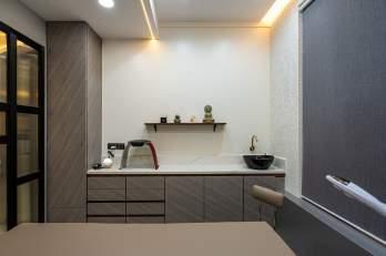 Common areas feature an ironing table, and concealed washing machine, and the kitchen, initially planned open, was adjusted for budget constraints with added utility in the balcony.