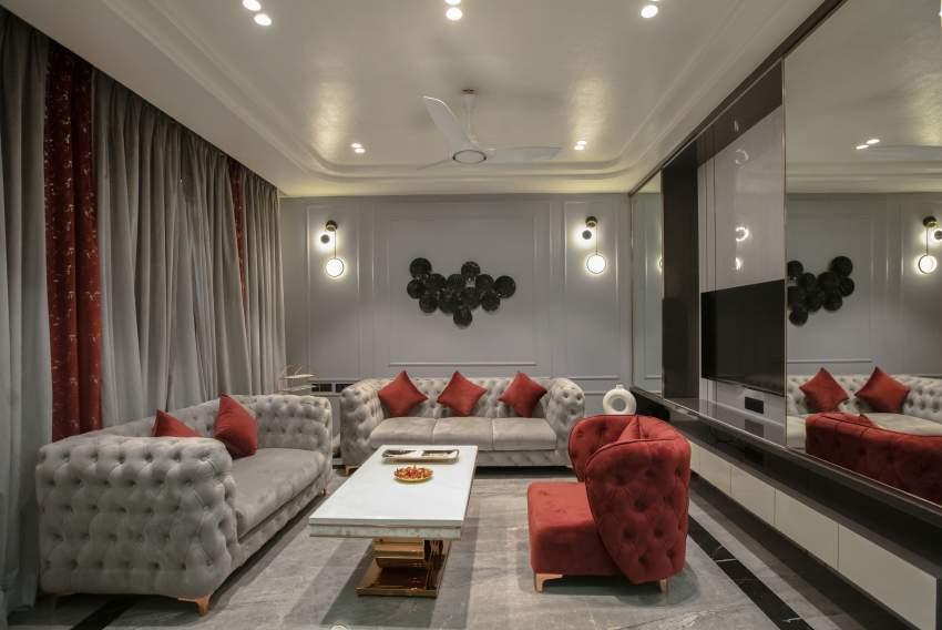 Enhancing the living room's spacious feel, a mirrored ceiling and strategically placed AC were implemented